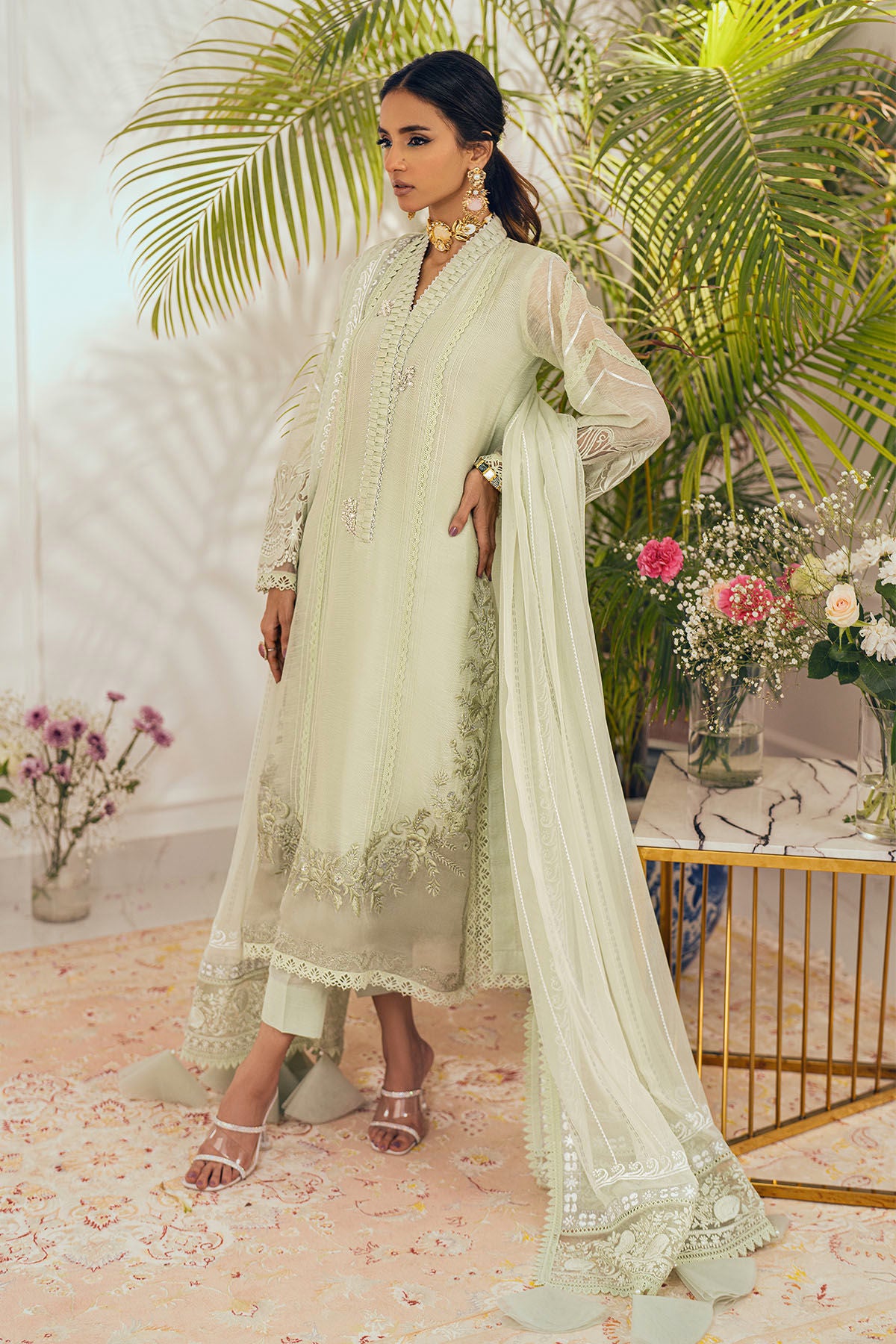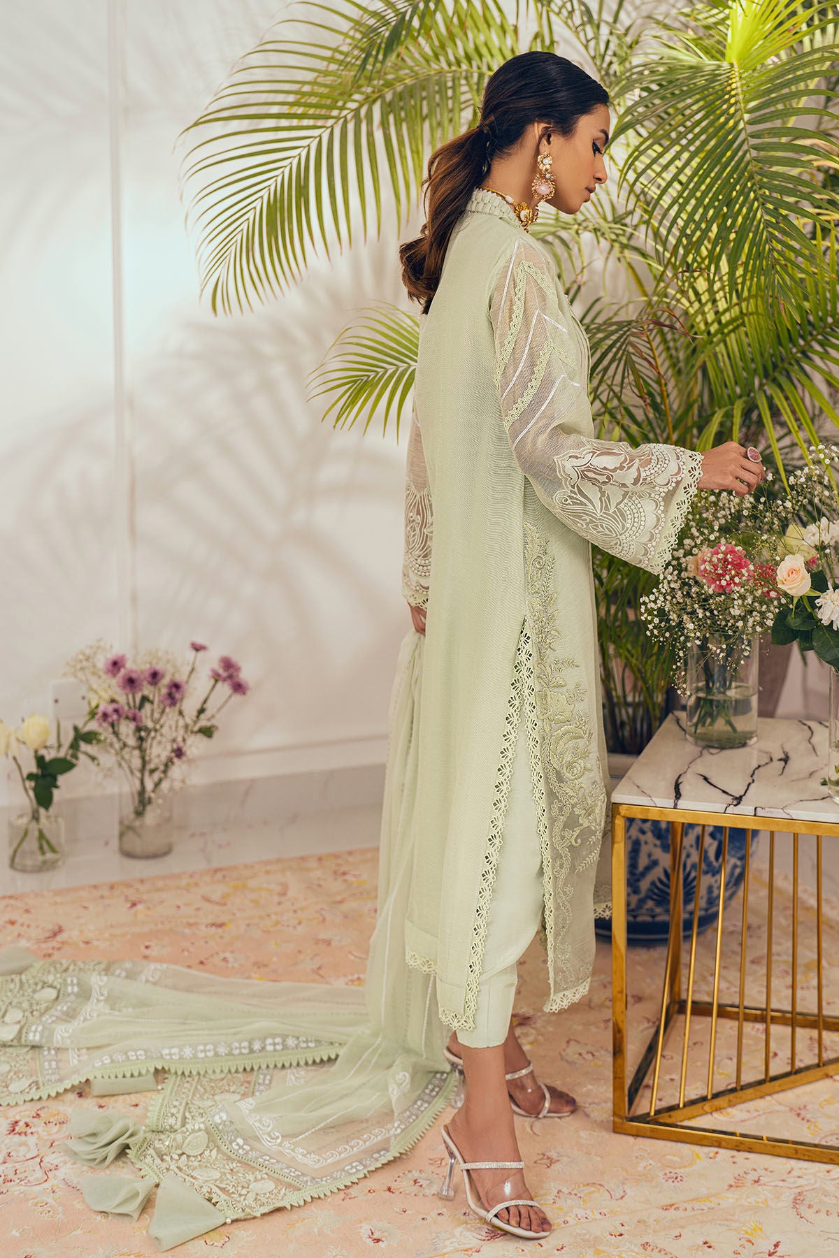 Long silhouette silk net shirt in subtle shade of mint featuring pleats and pin tucks details. The hemline is adorned with silk thread floral embroidered details on organza panel which is appliquéd to perfection. The neckline is stitched to perfection with fabric manipulation details along with hand crafted embellishments. The outfit can be paired with chiffon hand block printed dupatta featuring embossed sequins organza panel on each pallu which is further adorned with net tassels. The outfit can be paired with matching straight pants.
