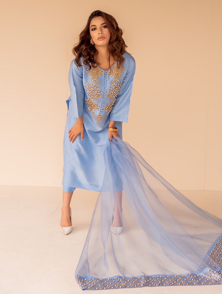 • Pure organza dupatta with hand done embellishments and pure raw silk 80gm trims