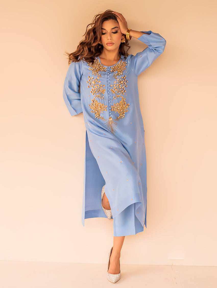 • Pure raw silk 80gm hand done embellished shirt with pure raw silk 80gm pants