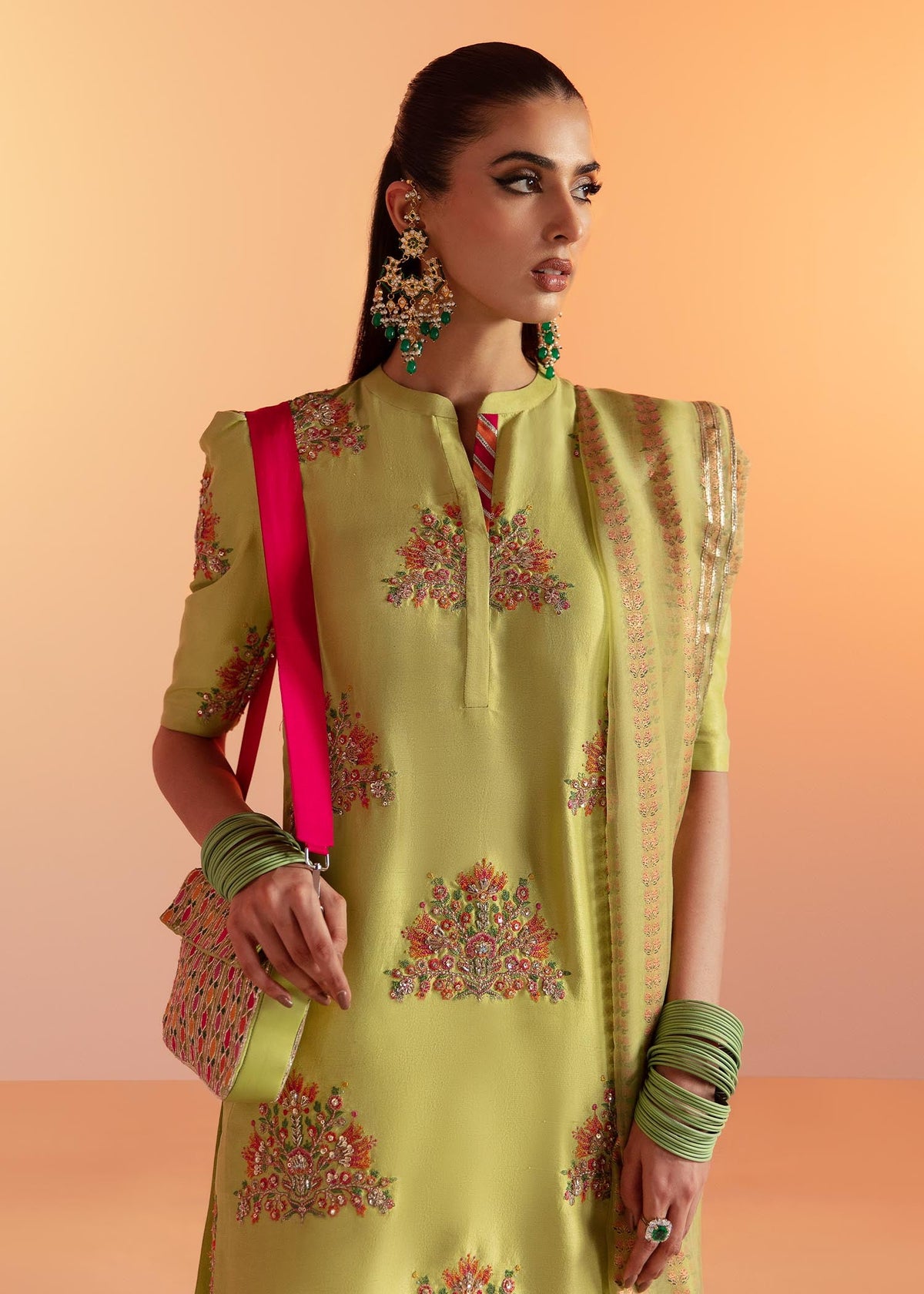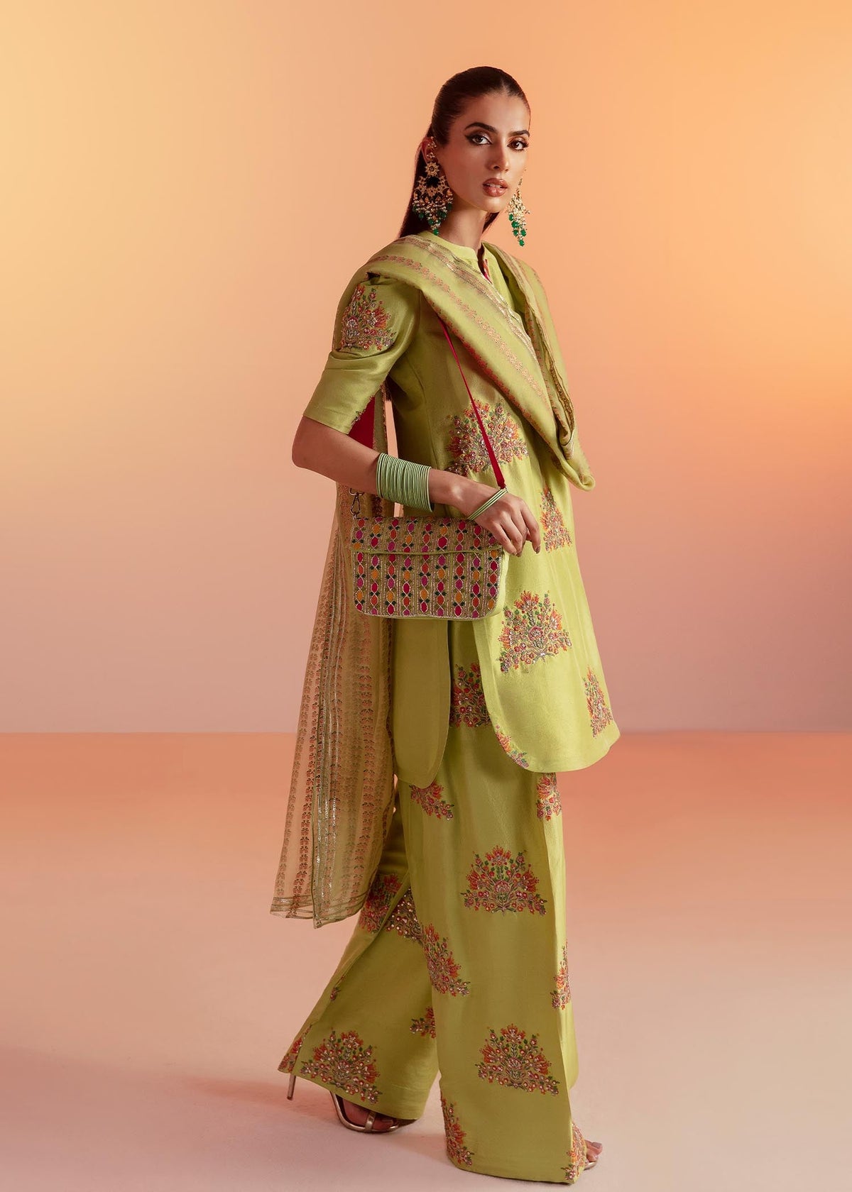 This banana green outfit glows like a rare gem with its intricate gold sequin and naqshi work. The pop of pink and ice blue cutdana adds a whimsical touch. The plain back of the shirt serves as a canvas for the stunning embellishments to take center stage.