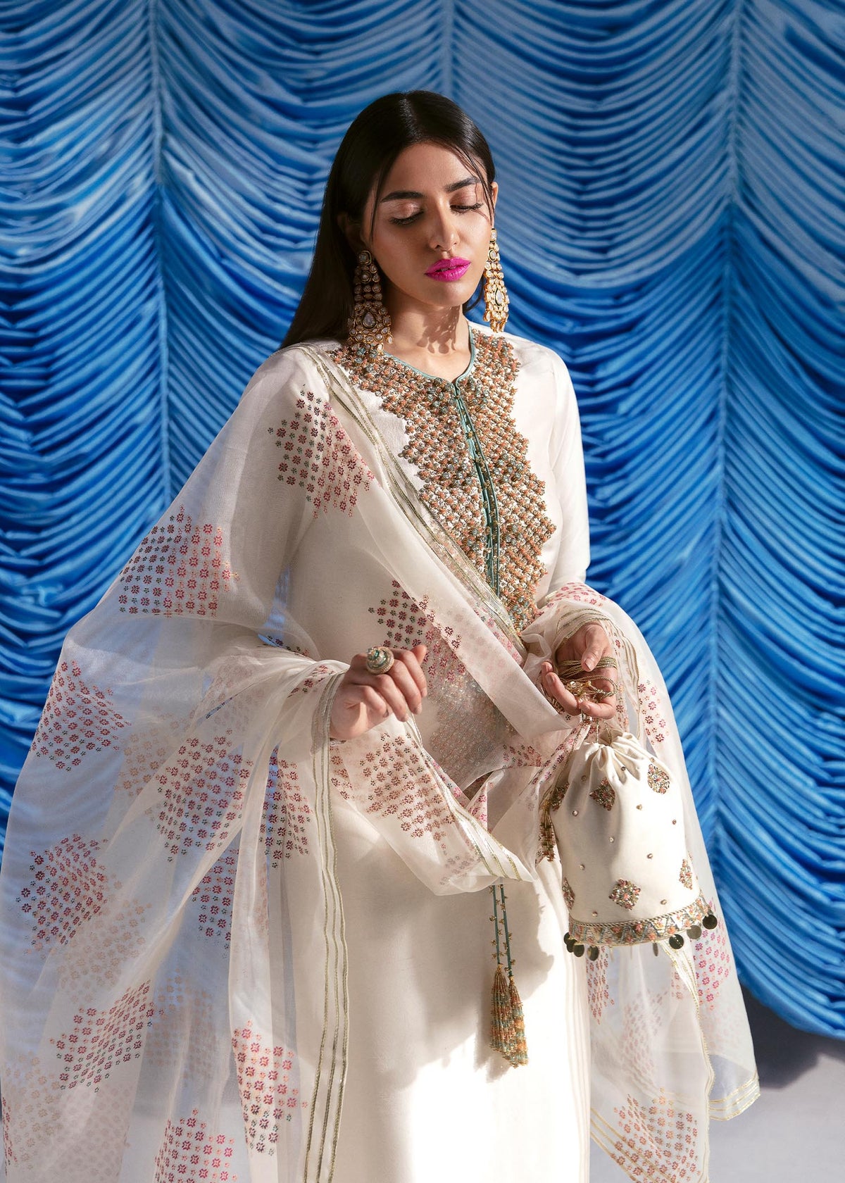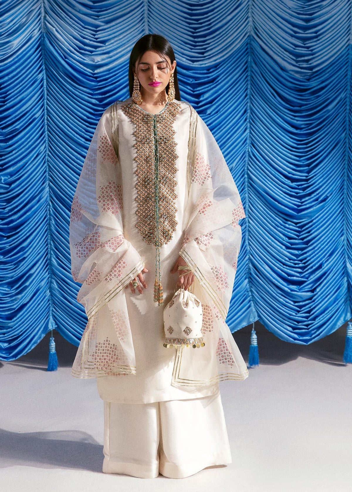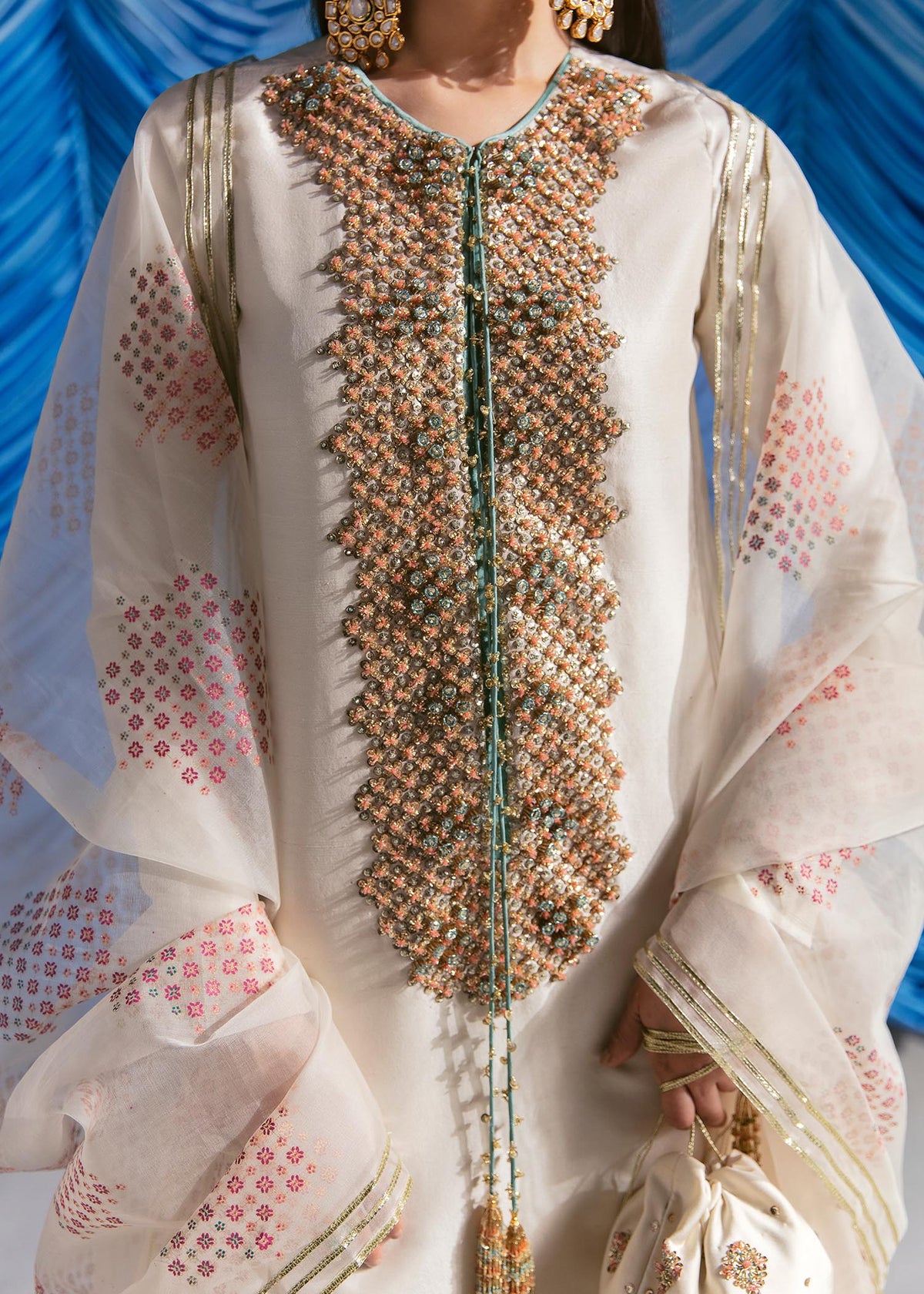 The beautiful ivory raw silk outfit boasts a 3D neckline which is embellished with shimmering gold sequins and delicate peach and ice blue cutdana. The dazzling combination of colors and textures creates a mesmerizing effect that captures the eye.