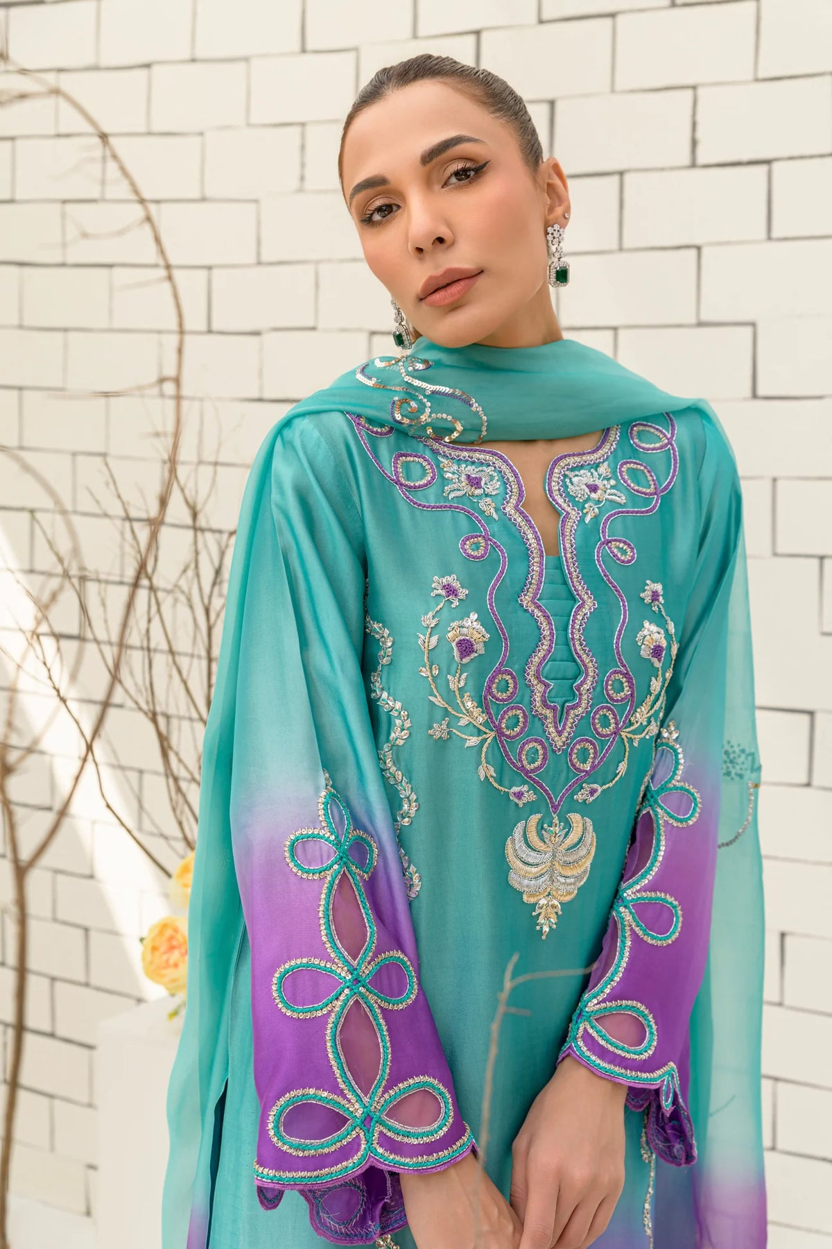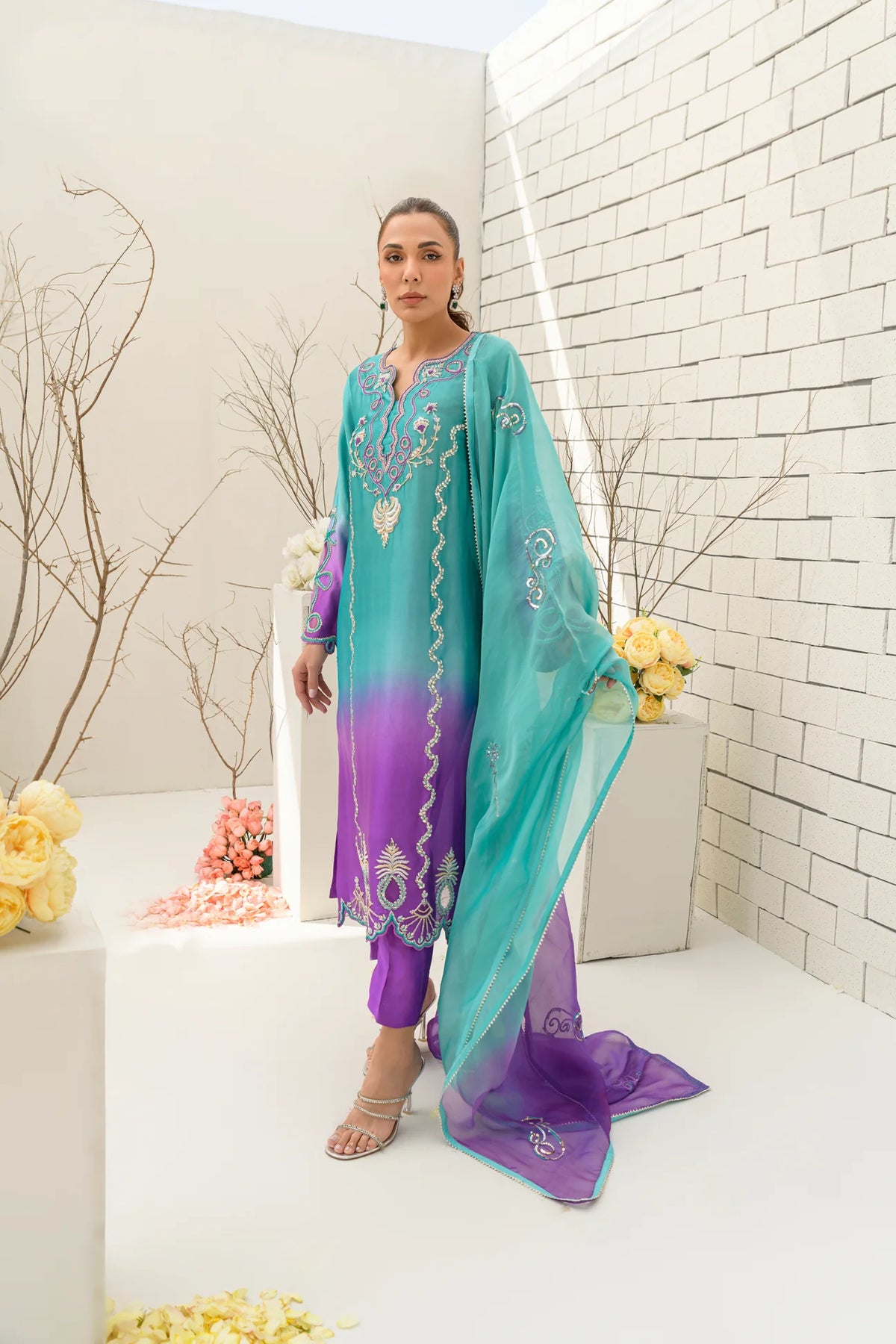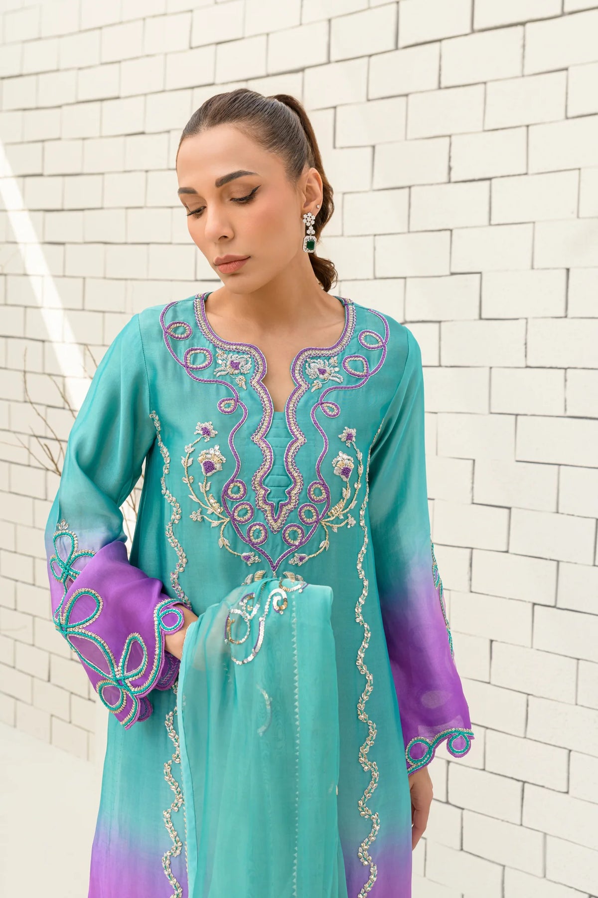 A dreamy blend of turquoise and bright lilac, Lavender Latte is crafted from premium pure sheesha silk for a luxurious finish. The ombre-toned shirt is paired with a pure sheesha organza dupatta, creating a harmonious and ethereal look. Featuring intricate dabka, kora, resham, and Swarovski embellishments, this design is elevated by cutwork and applique techniques. A perfect fusion of delicate craftsmanship and contemporary elegance.