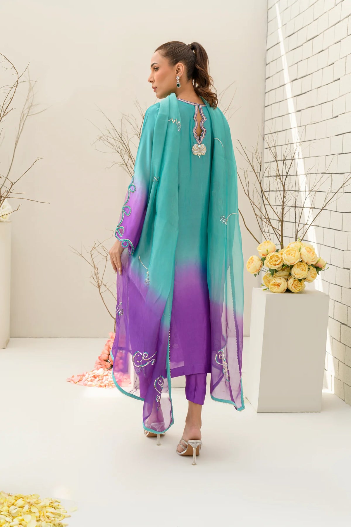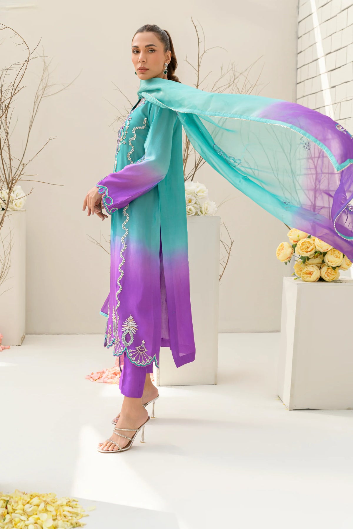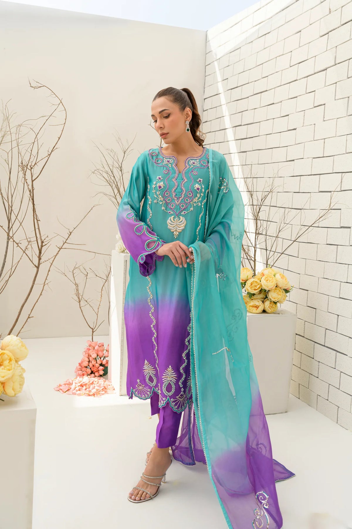A dreamy blend of turquoise and bright lilac, Lavender Latte is crafted from premium pure sheesha silk for a luxurious finish. The ombre-toned shirt is paired with a pure sheesha organza dupatta, creating a harmonious and ethereal look. Featuring intricate dabka, kora, resham, and Swarovski embellishments, this design is elevated by cutwork and applique techniques. A perfect fusion of delicate craftsmanship and contemporary elegance.