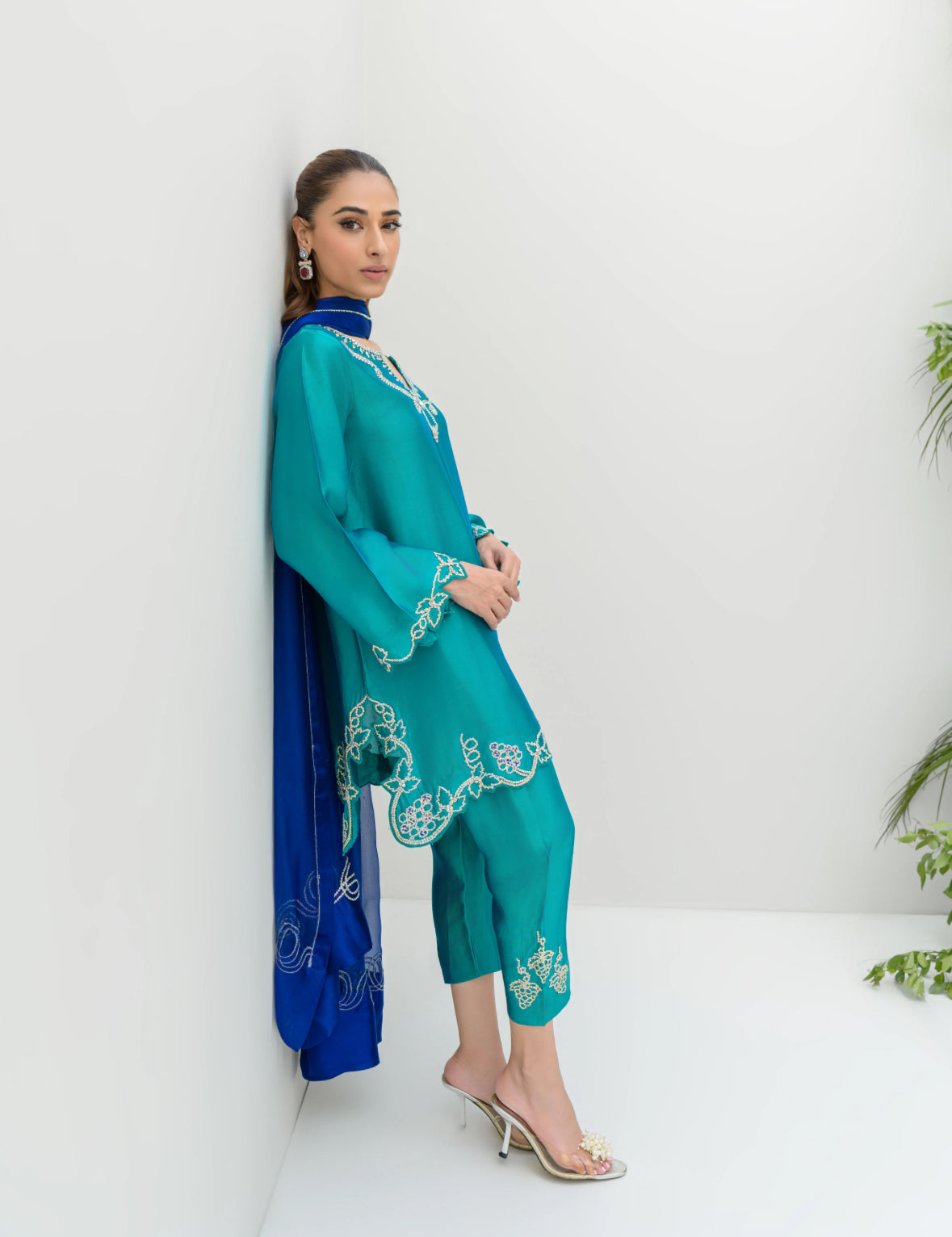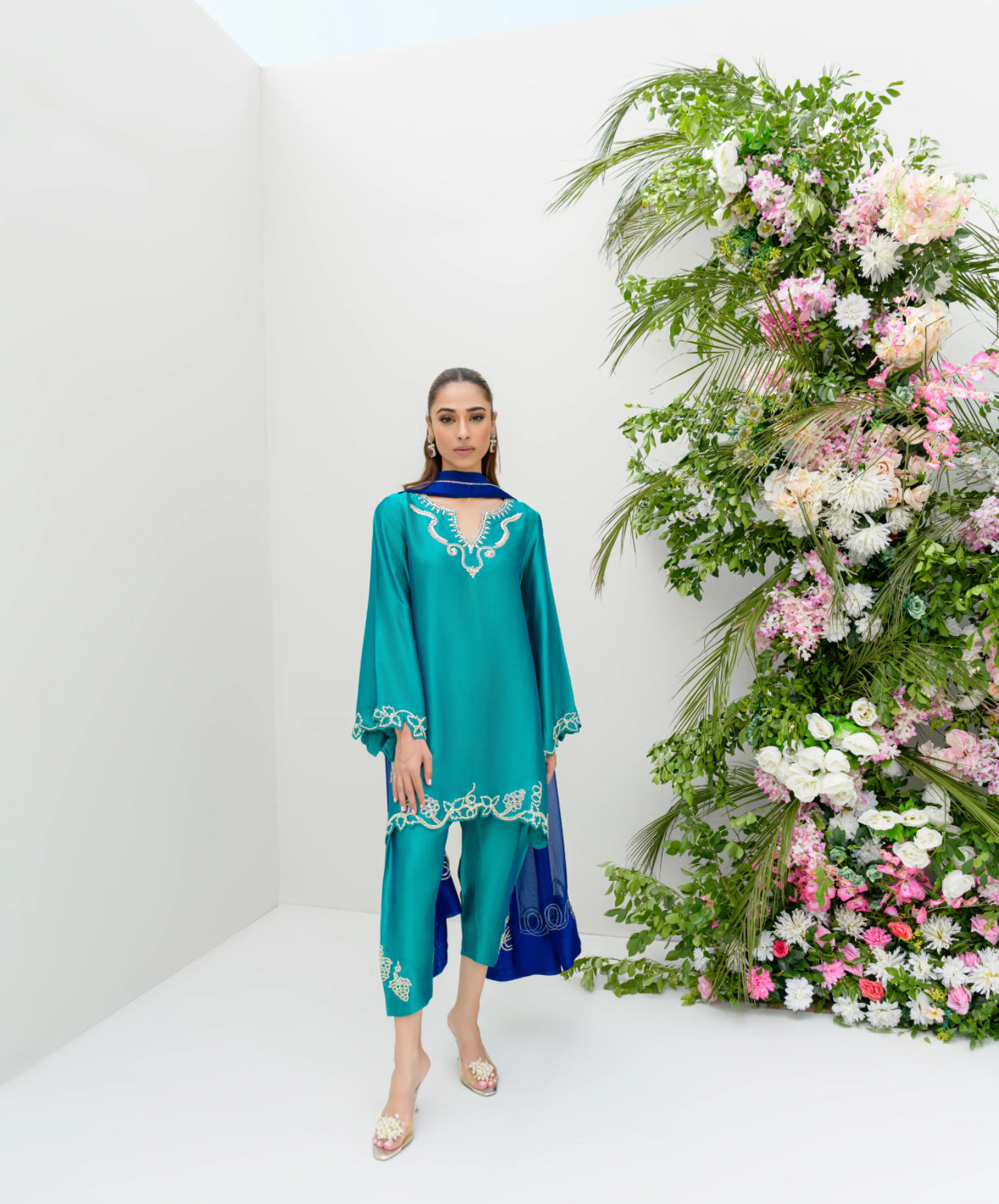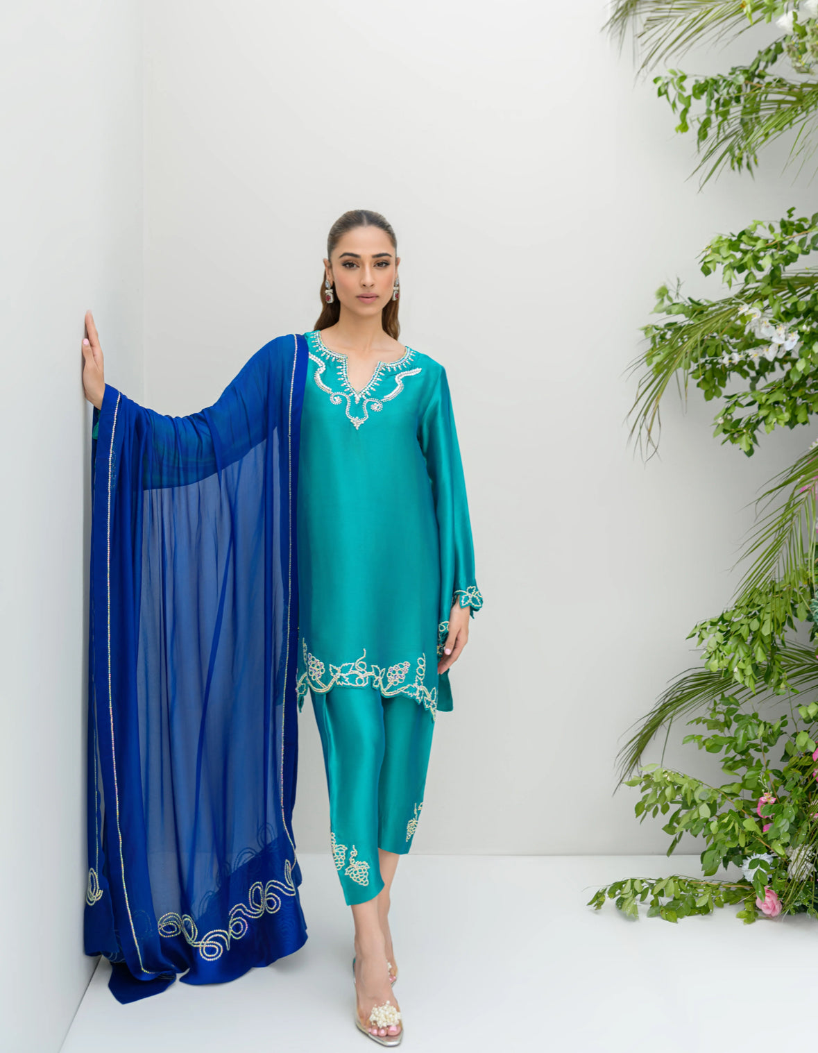 The AquaOcean dress is a signature piece inspired by the popular Oceanblue and Aquamarine dresses. It features a vibrant green shirt and shalwar, crafted from pure sheesha silk, paired with a contrasting blue dupatta. The ensemble is adorned with Swarovski work designed in the shape of grapes, adding a touch of elegance and sparkle. The dupatta also features circular Swarovski embellishments, enhancing its visual appeal and tying the outfit together with a sophisticated finish.