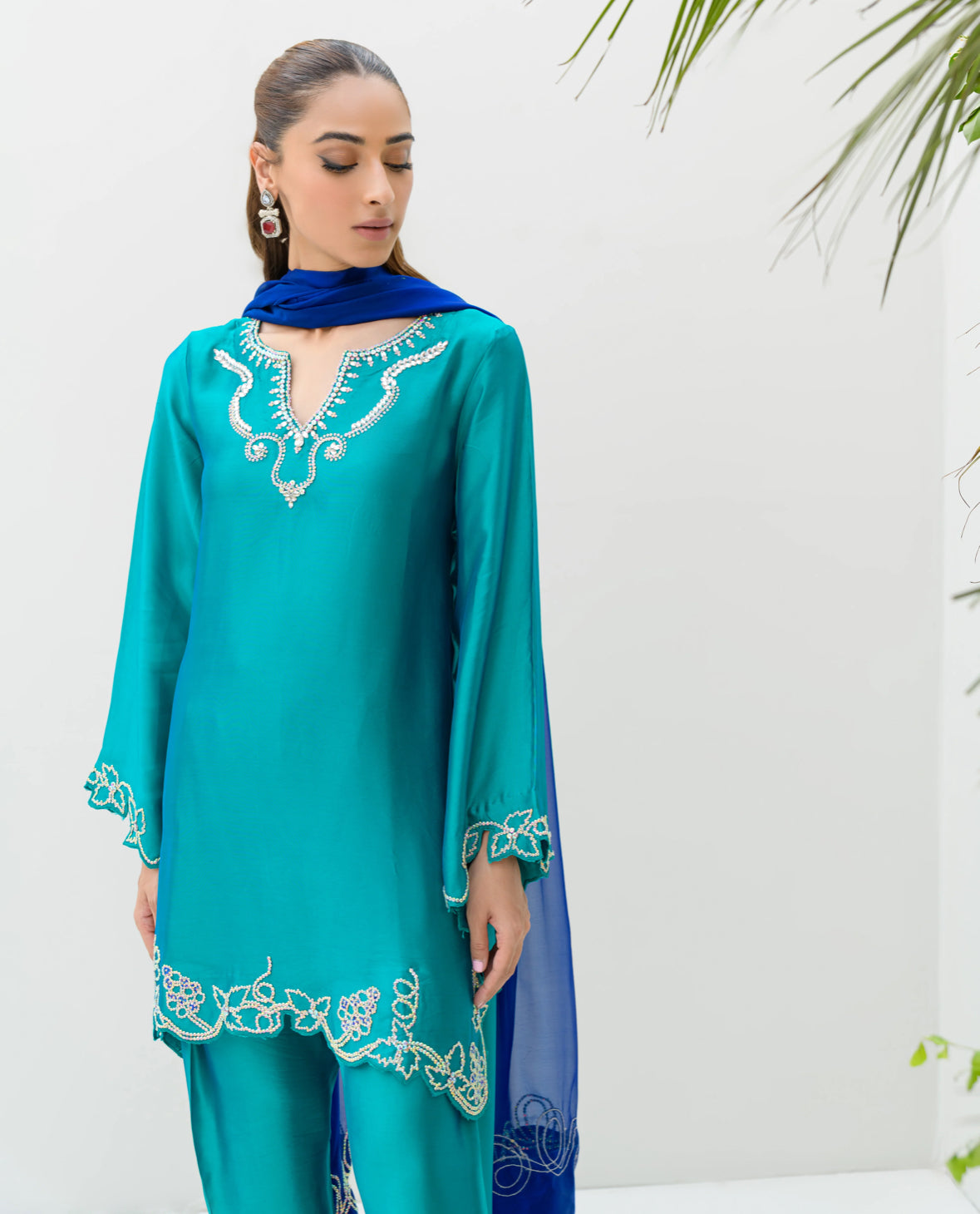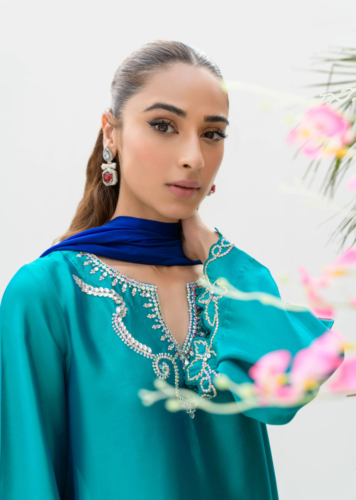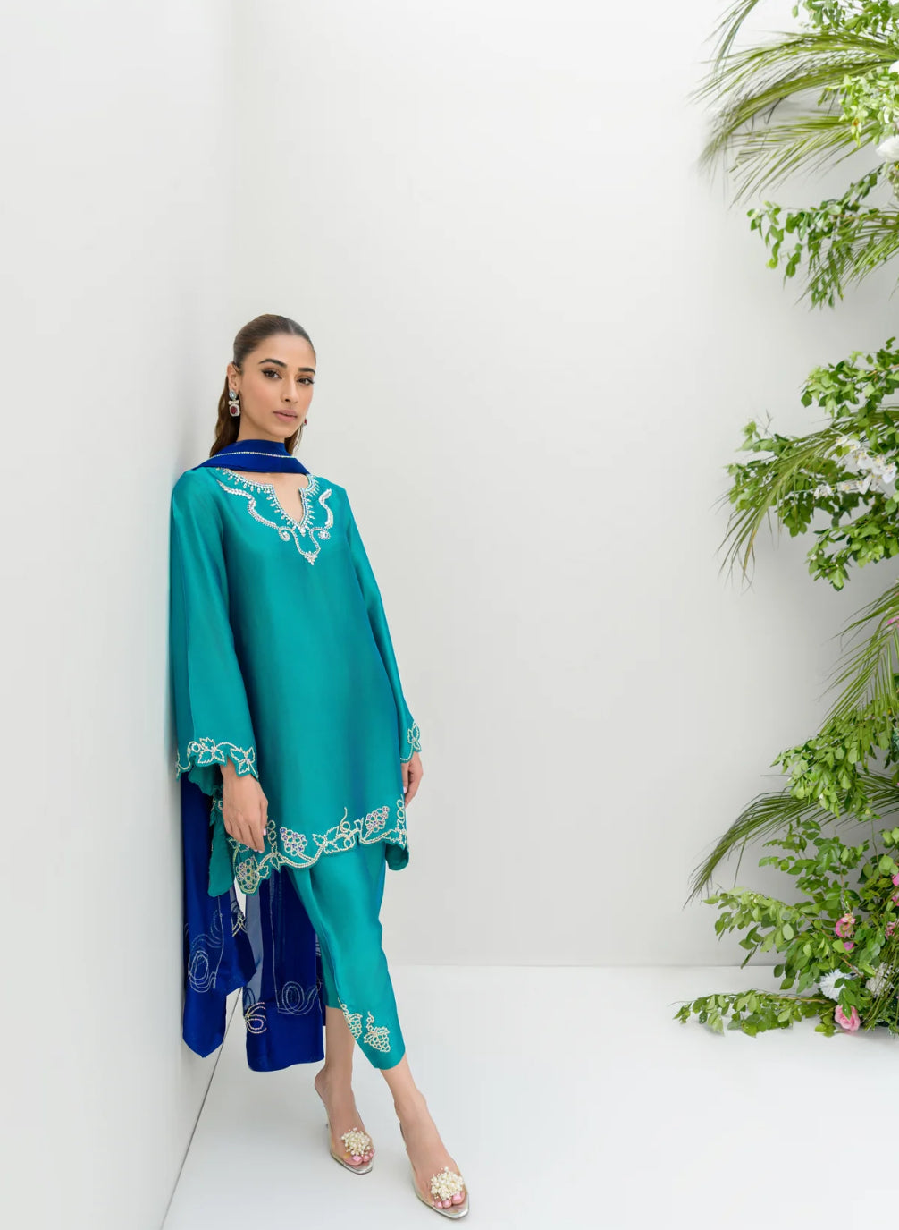 The AquaOcean dress is a signature piece inspired by the popular Oceanblue and Aquamarine dresses. It features a vibrant green shirt and shalwar, crafted from pure sheesha silk, paired with a contrasting blue dupatta. The ensemble is adorned with Swarovski work designed in the shape of grapes, adding a touch of elegance and sparkle. The dupatta also features circular Swarovski embellishments, enhancing its visual appeal and tying the outfit together with a sophisticated finish.