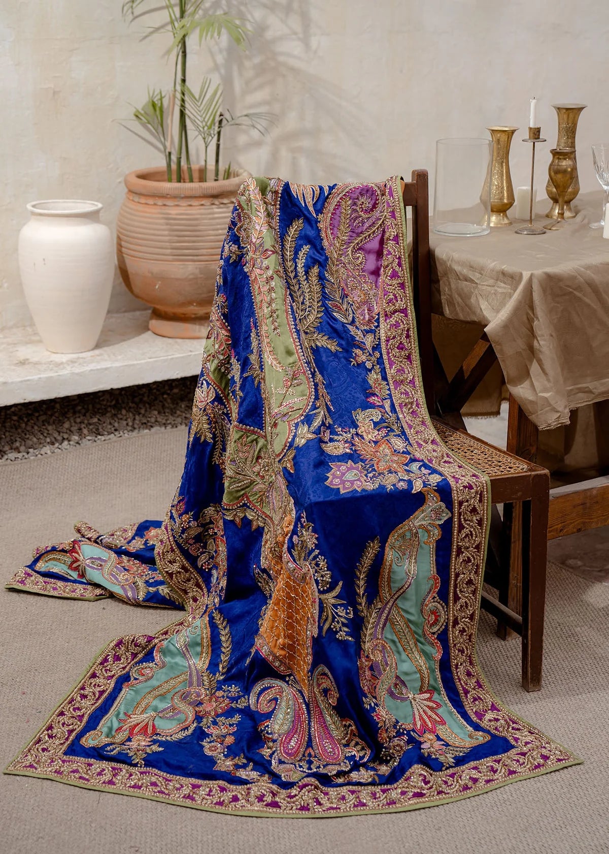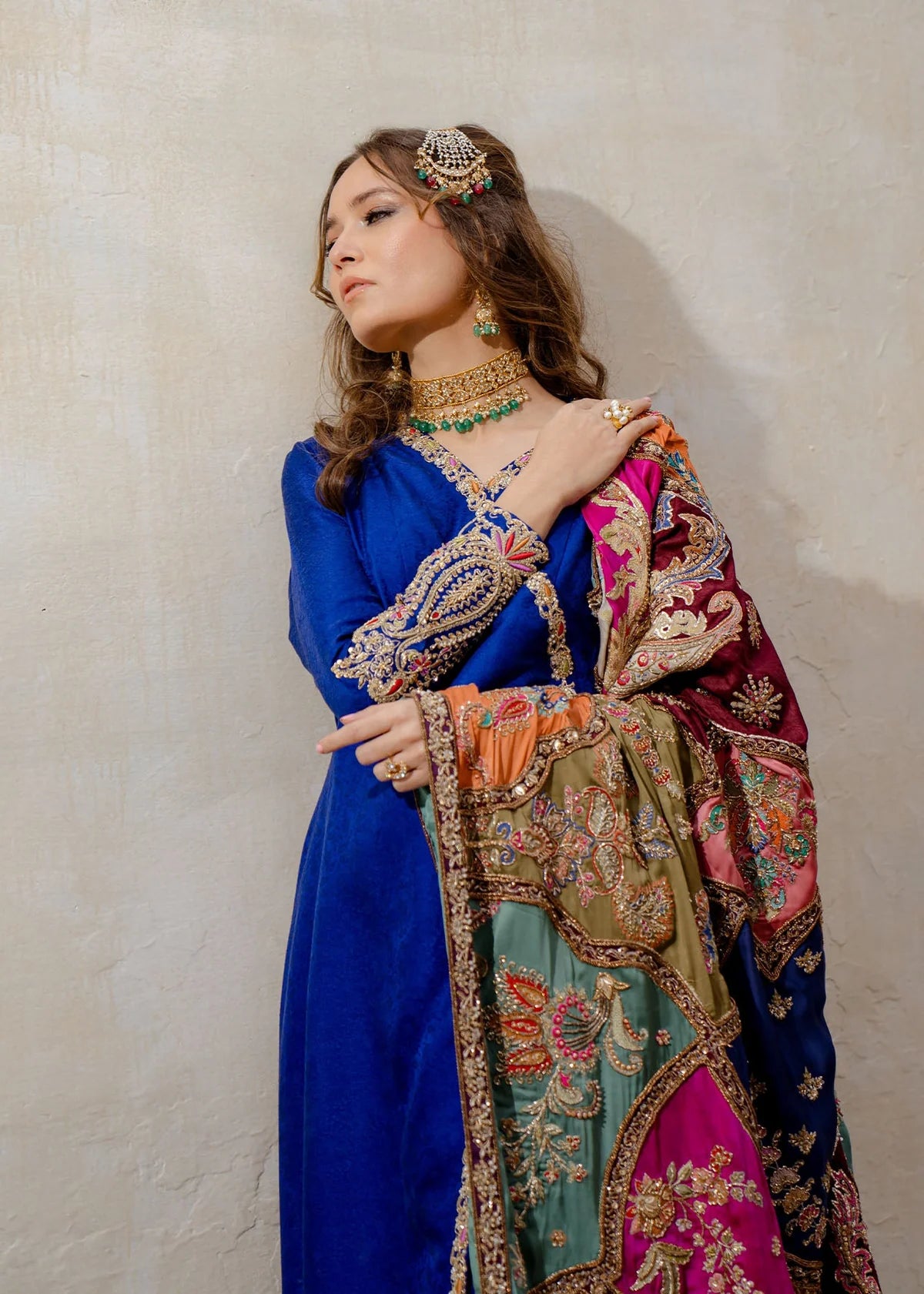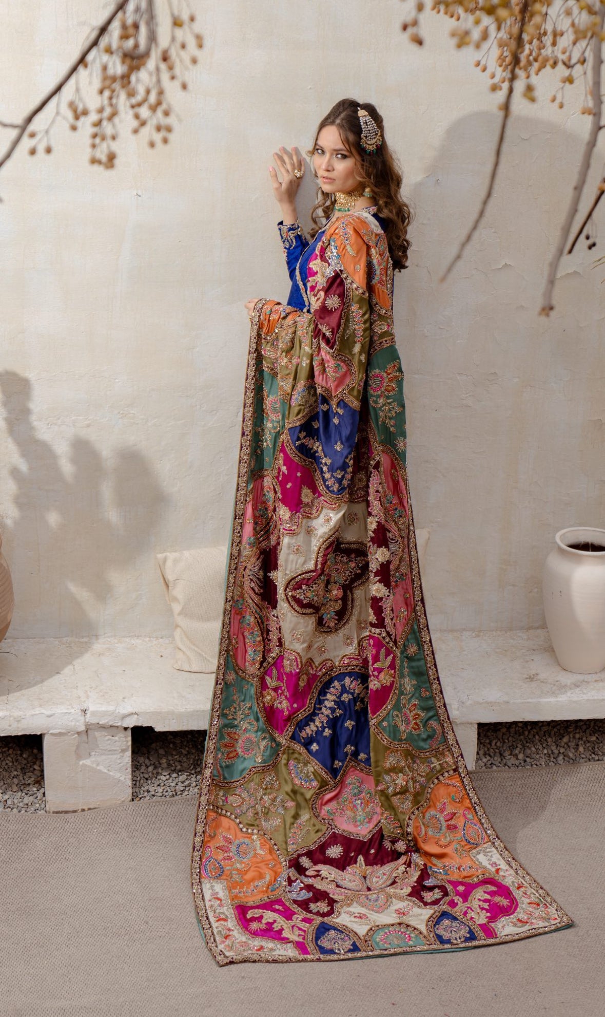 Ayla is a captivating canvas of sublime blue, is adorned with intricate floral embroidery over a patch work, featuring alluring shades of blue, green, rust, and ivory. The detailed composition, serving as the canvas, adds a uniquely exquisite dimension to the shawl. This artistic masterpiece is complemented by a contrasting deep-hued embroided dress, adorned with traditional marori embroidery motifs, making it a design equivalent to a work of art.