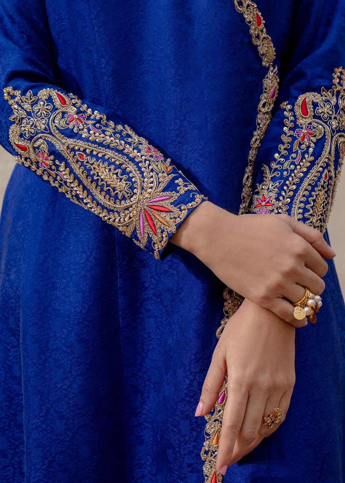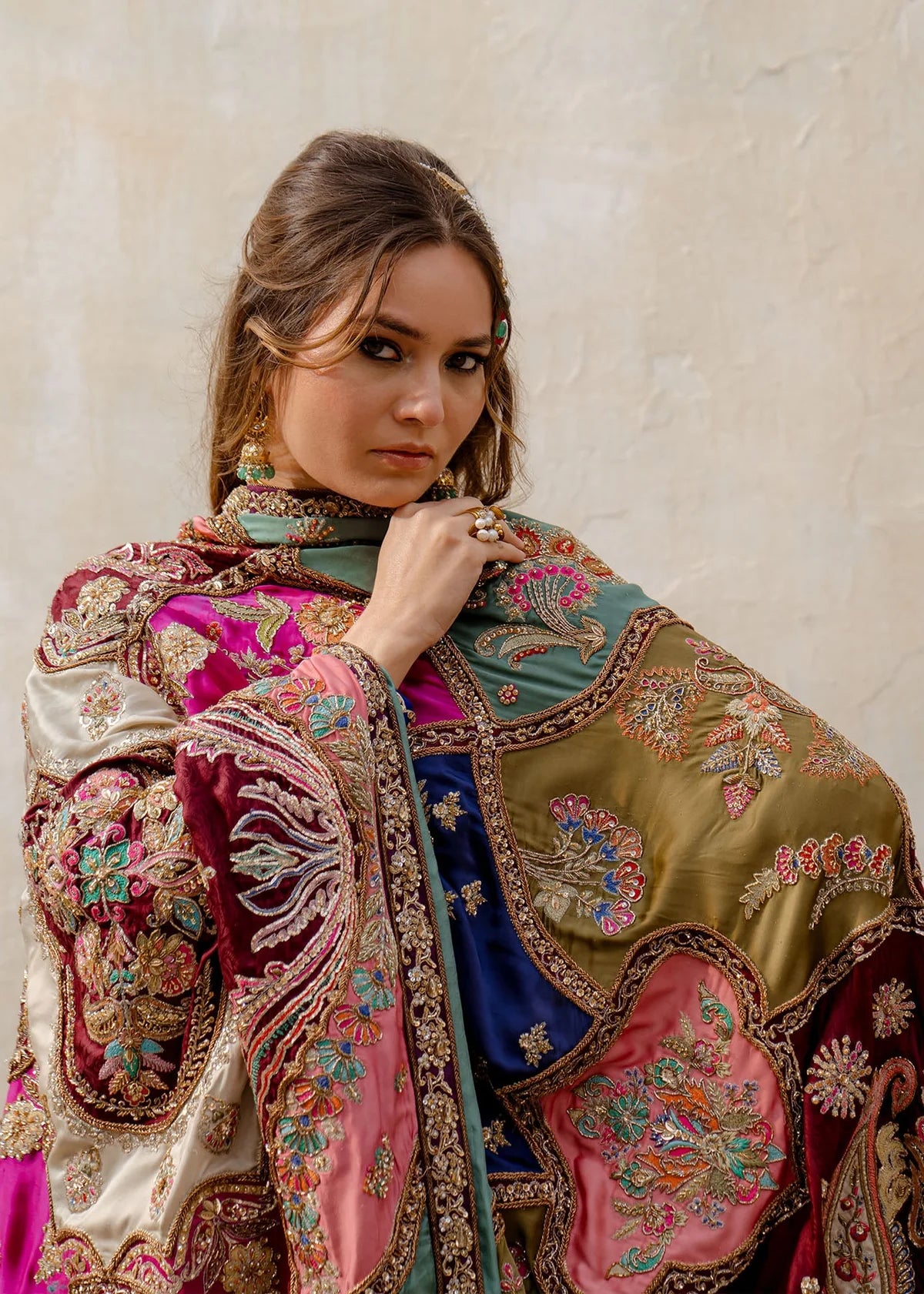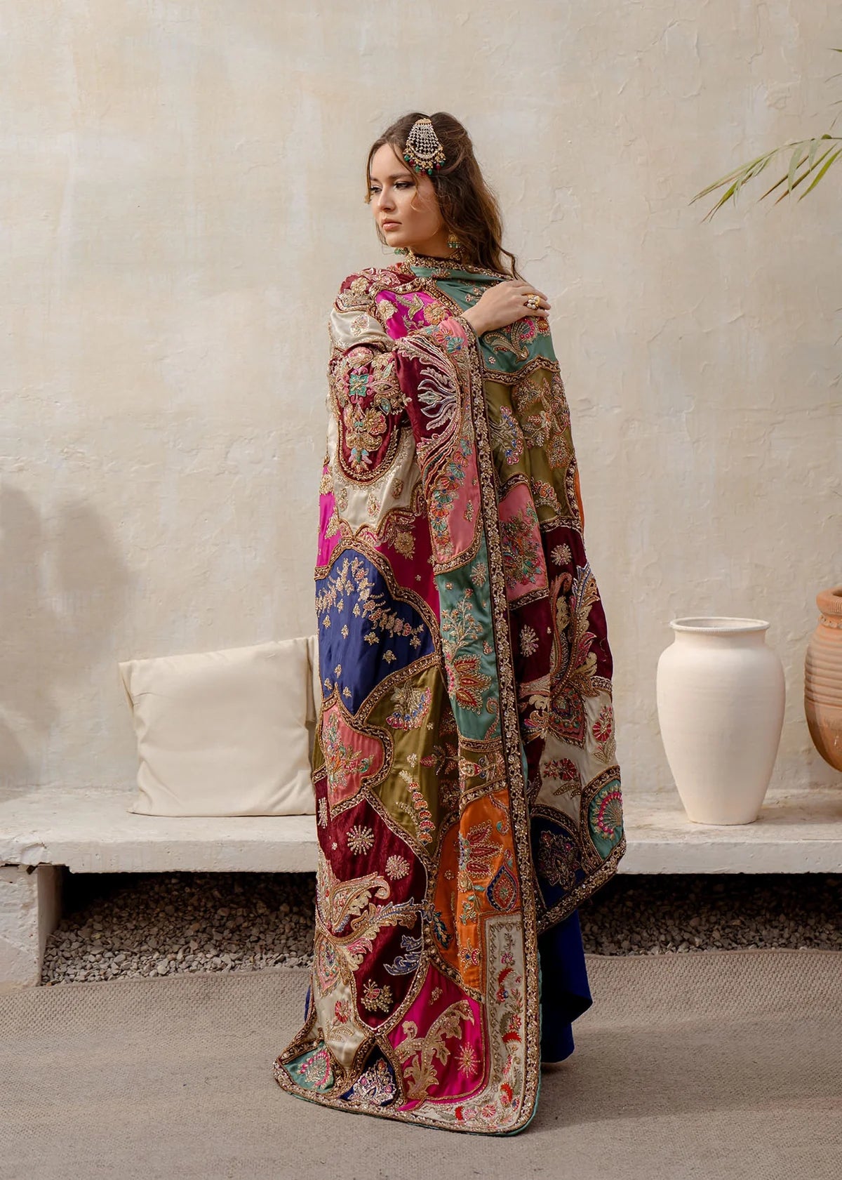 Ayla is a captivating canvas of sublime blue, is adorned with intricate floral embroidery over a patch work, featuring alluring shades of blue, green, rust, and ivory. The detailed composition, serving as the canvas, adds a uniquely exquisite dimension to the shawl. This artistic masterpiece is complemented by a contrasting deep-hued embroided dress, adorned with traditional marori embroidery motifs, making it a design equivalent to a work of art.