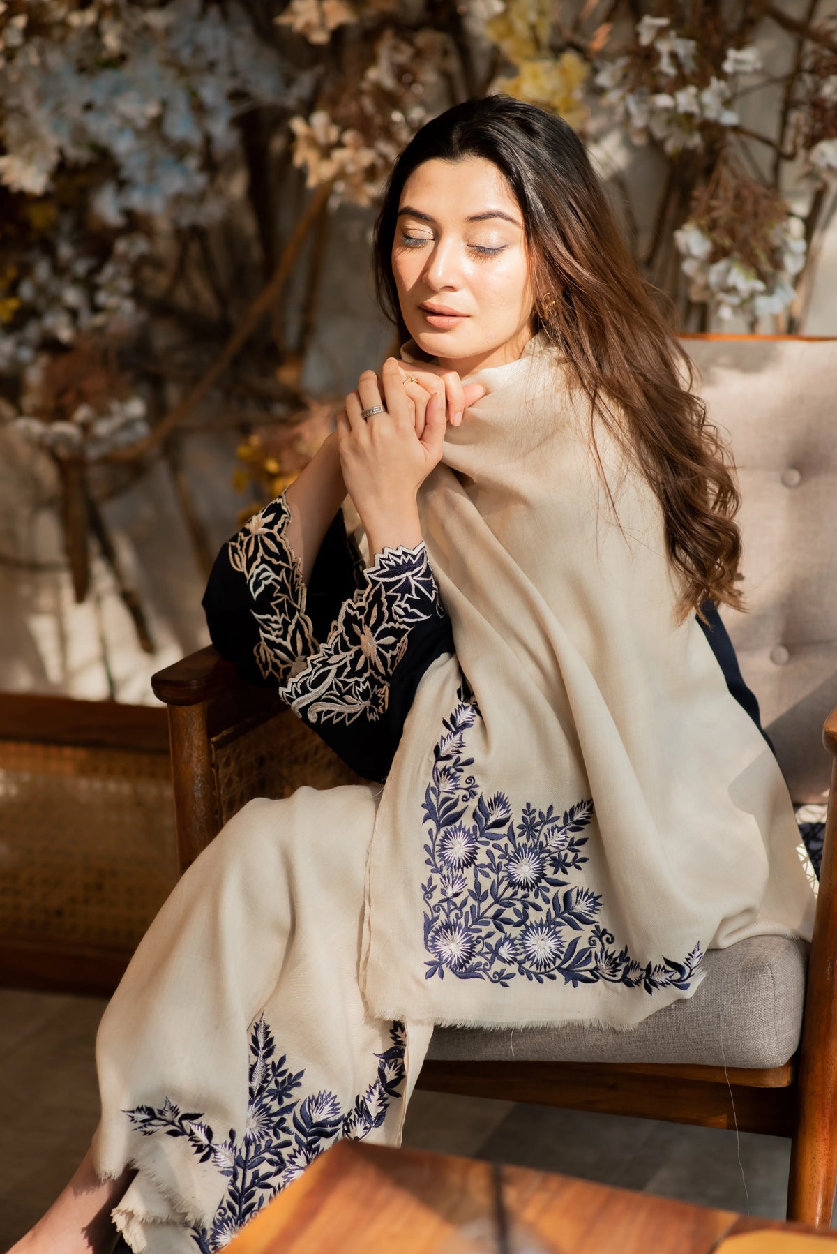 Stitched suit on pure karandi with pure woollen shawl (fully embroidered suit and shawl).