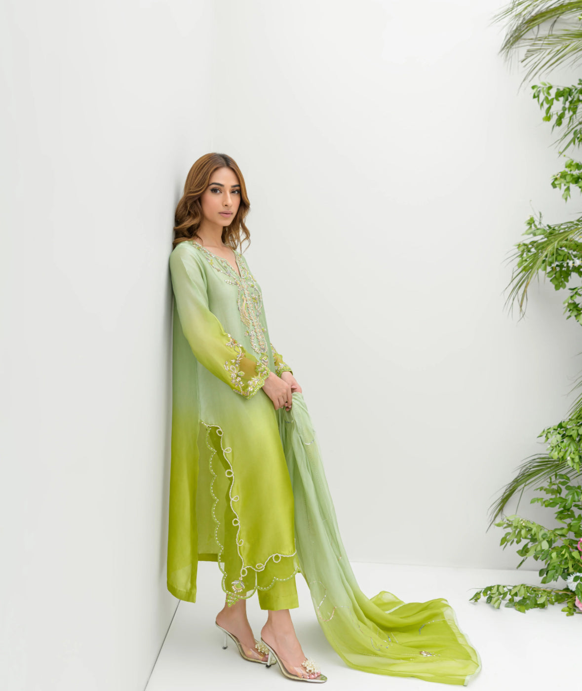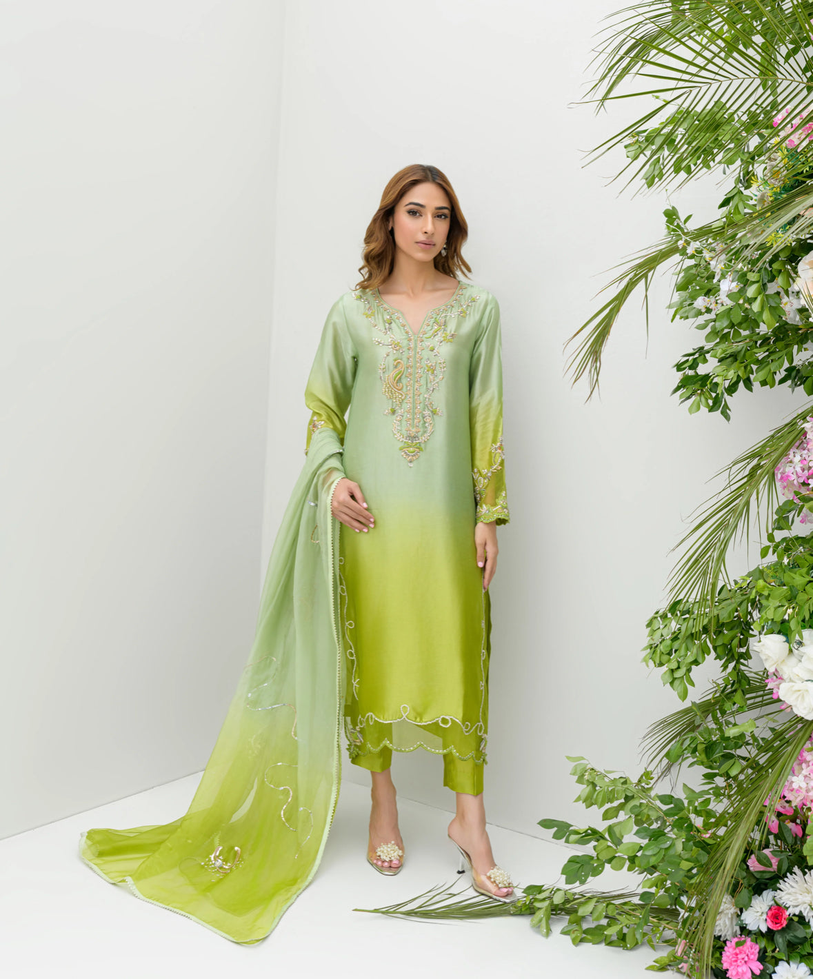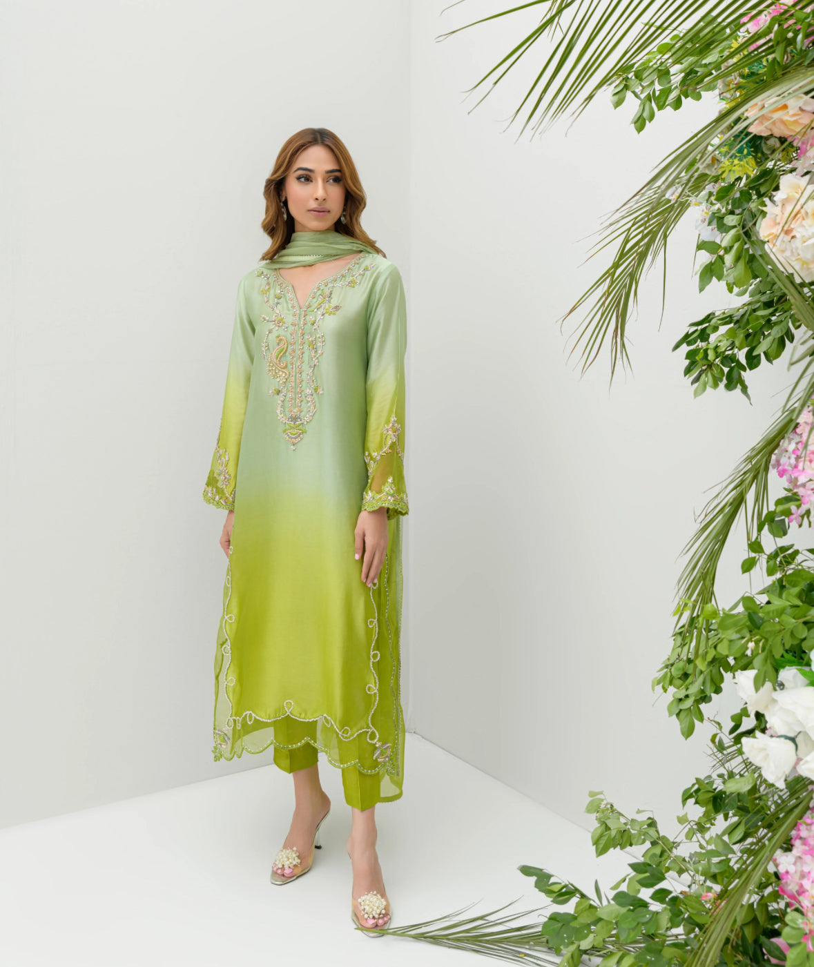 This ensemble features a lime-colored ombre long shirt, which transitions from a lighter to a deeper shade of green. The shirt is paired with straight, narrow-cut pants for a sleek silhouette. Complementing the outfit is an organza dupatta, adding a touch of elegance. The fabric is crafted from pure sheesha silk, renowned for its luxurious texture. Adorning the outfit is intricate silver kora work and Swarovski embellishments, which are strategically placed along the hemline, border, and dupatta, adding a refined sparkle and enhancing the overall sophistication of the design.