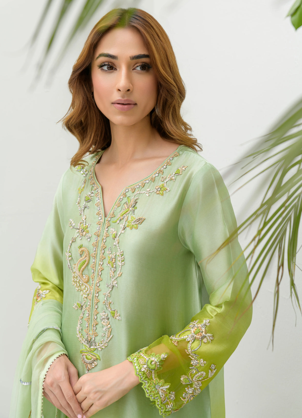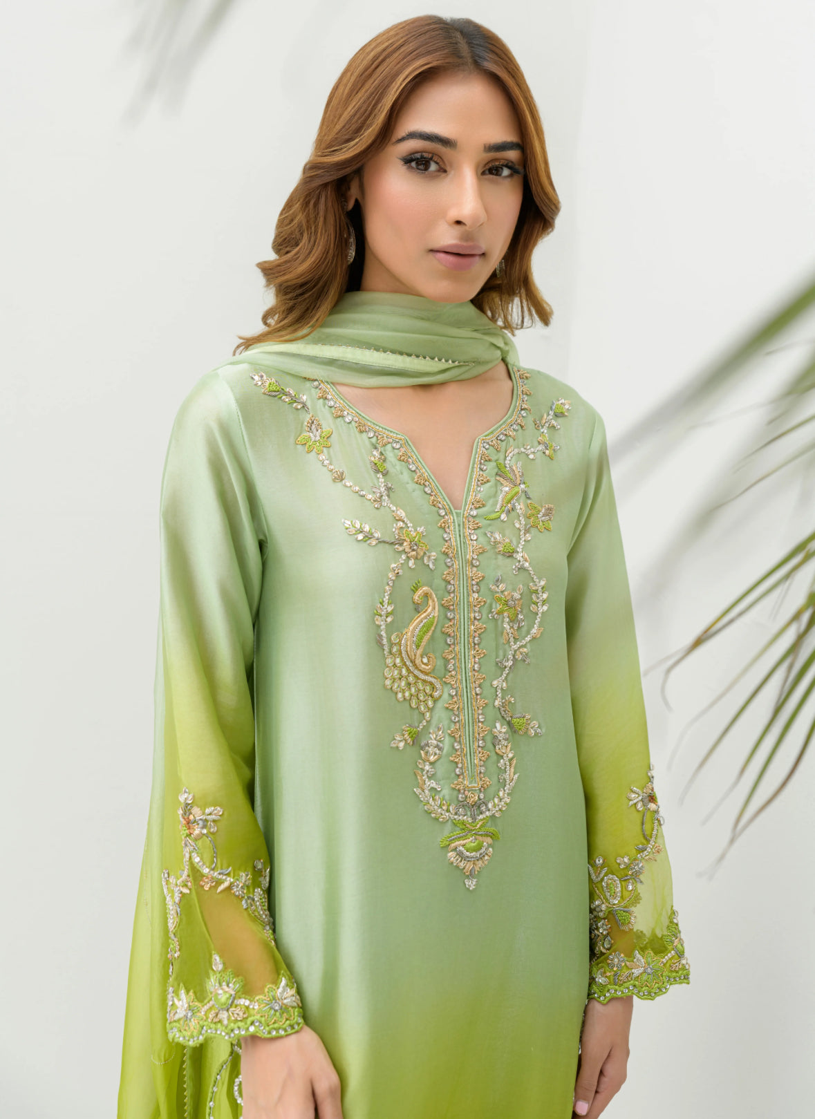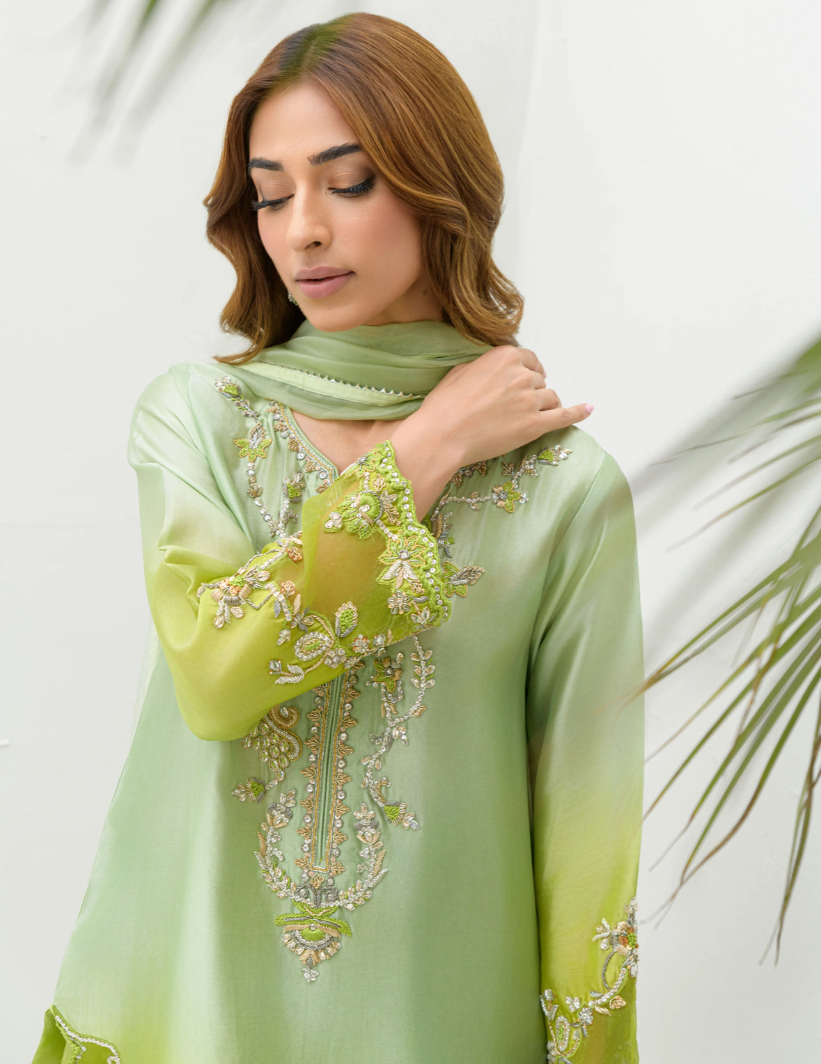 This ensemble features a lime-colored ombre long shirt, which transitions from a lighter to a deeper shade of green. The shirt is paired with straight, narrow-cut pants for a sleek silhouette. Complementing the outfit is an organza dupatta, adding a touch of elegance. The fabric is crafted from pure sheesha silk, renowned for its luxurious texture. Adorning the outfit is intricate silver kora work and Swarovski embellishments, which are strategically placed along the hemline, border, and dupatta, adding a refined sparkle and enhancing the overall sophistication of the design.