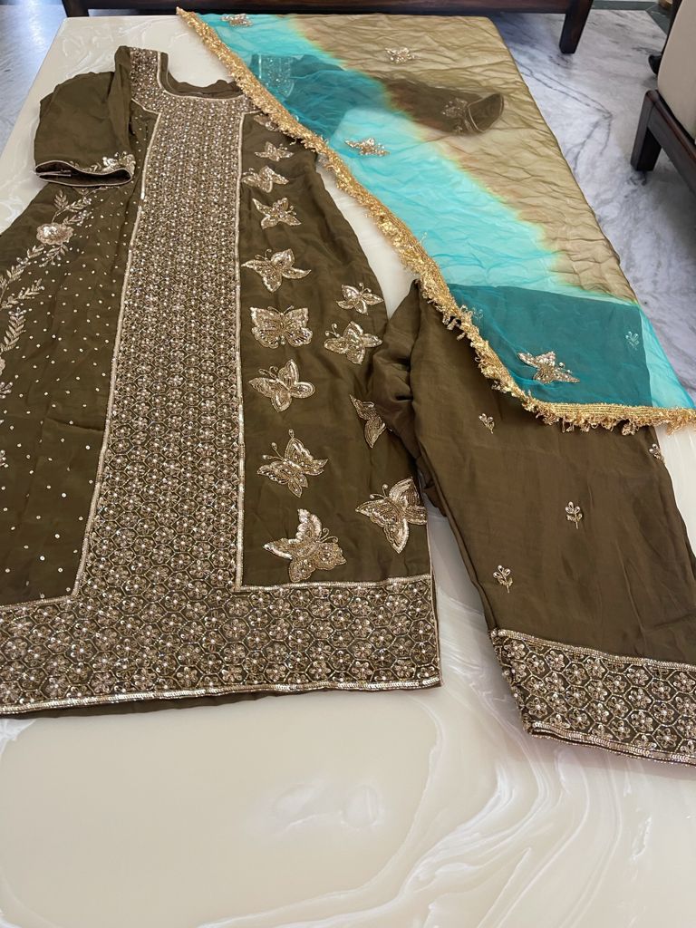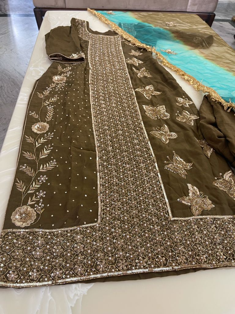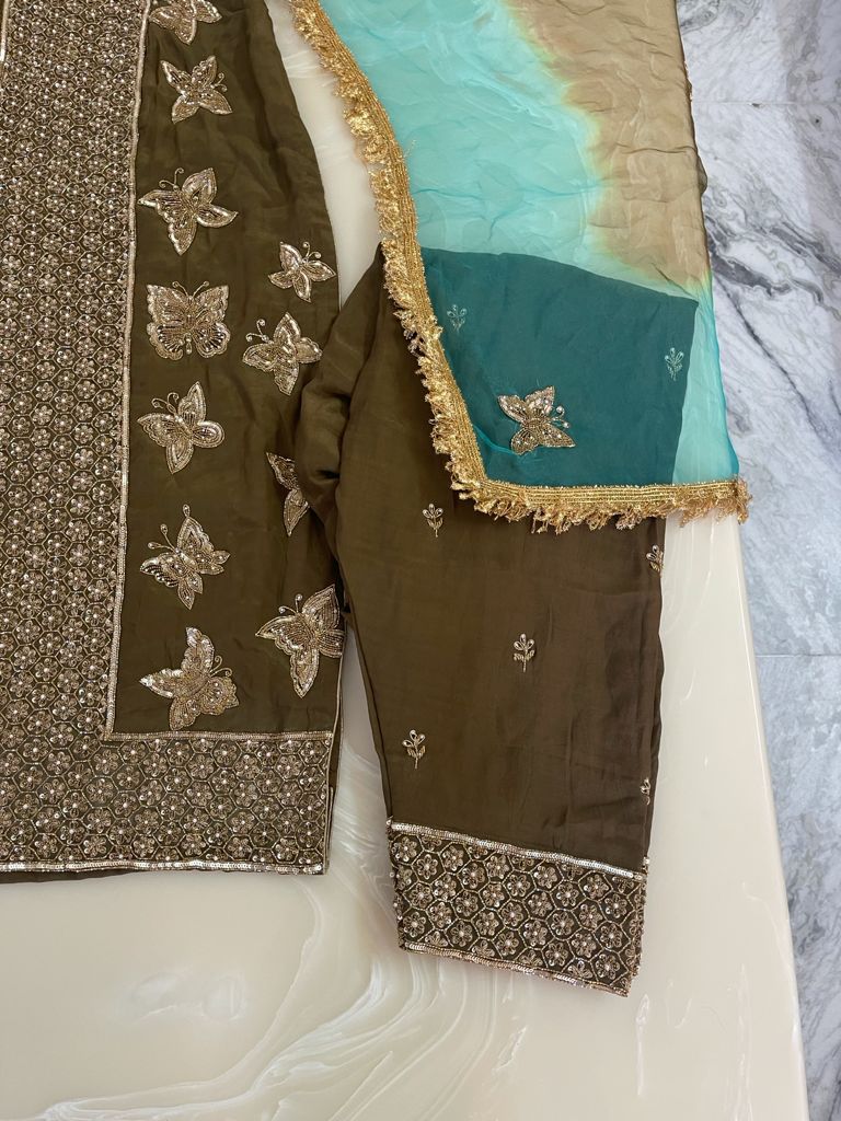 Our Beautiful Pure crepe shirt is adorned with intricate hand embroidery, featuring delicate sequins, dabka, motti, and katdana work.