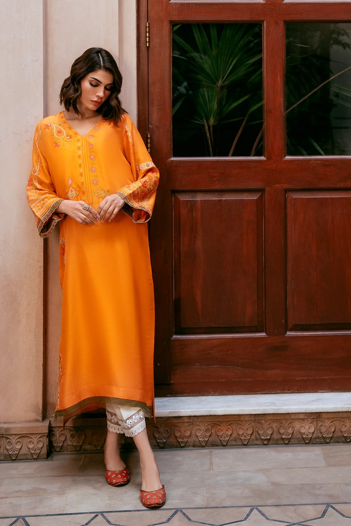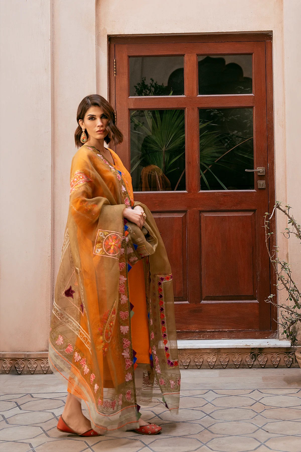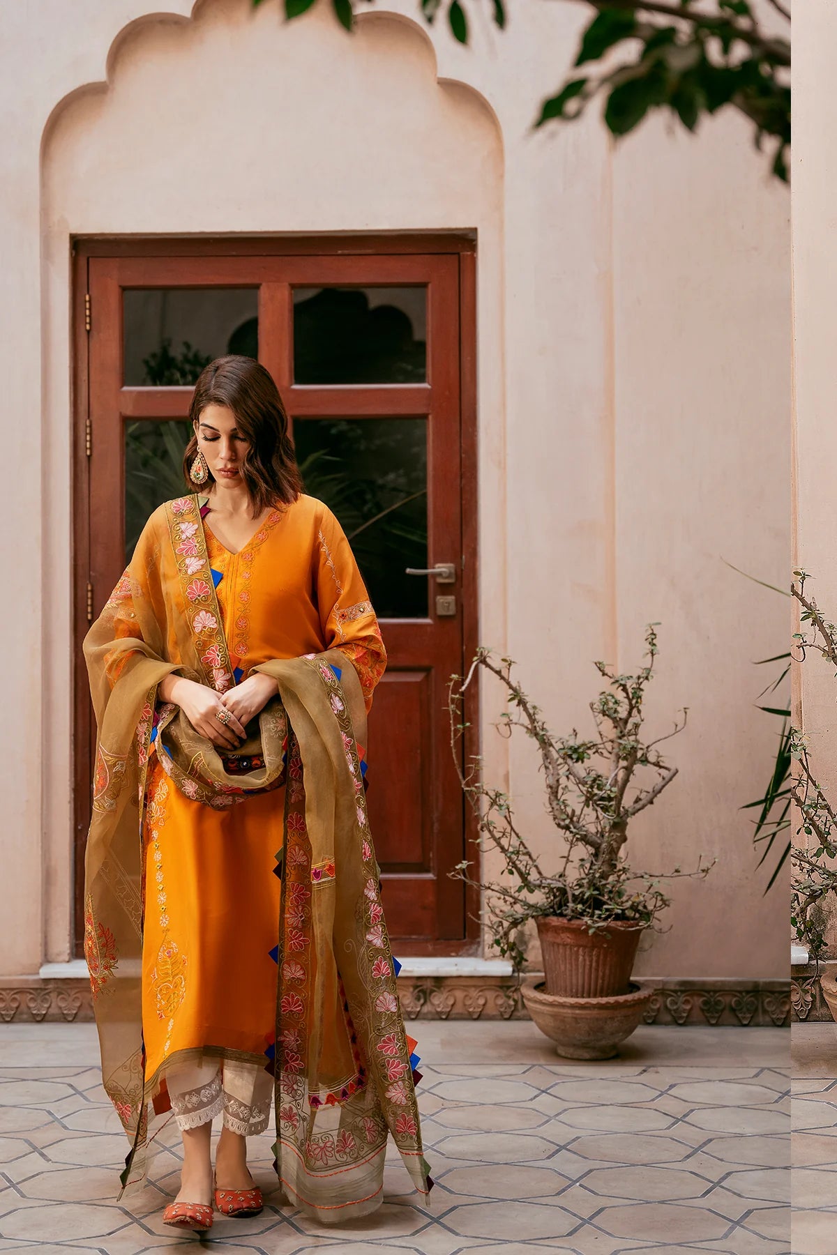 M I R H A , is a stunning piece with beautiful tailoring and flattering cuts, perfect for both brunches and dinners. The intricate embroidery adds an elegant touch, while the mirror work creates a captivating sparkle. Vibrant appliqués bring a lively pop of color, making this outfit a fabulous choice for the festive celebrations