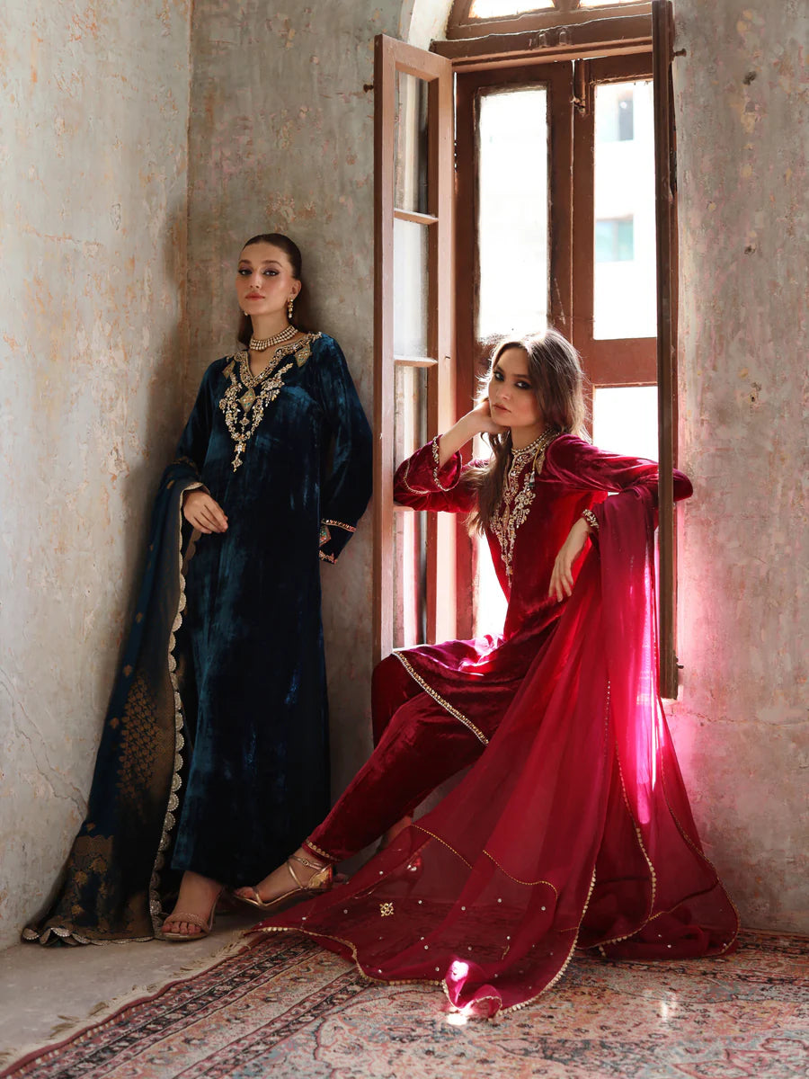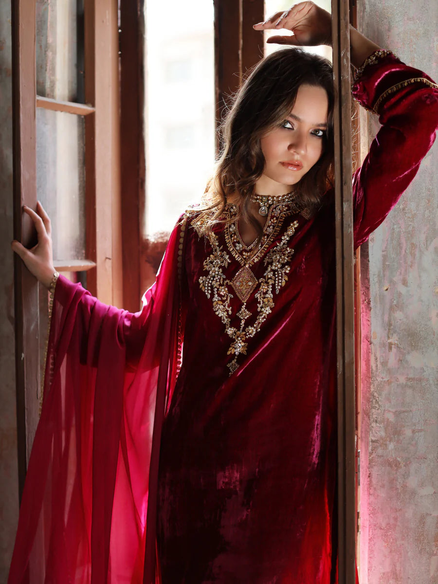 Channeling the old world charm of a Short kurta paired with a classic skinny shalwar, NUR is a standout creation crafted from luxurious pure velvet in deep plum color. The kurta is beautifully adorned with intricate Indian motifs and florals detailed with cutdana, stones, beads, pearls, metallic sequins and traditional zardozi along the front neckline, sleeves, and hem, adding depth and elegance to the design.