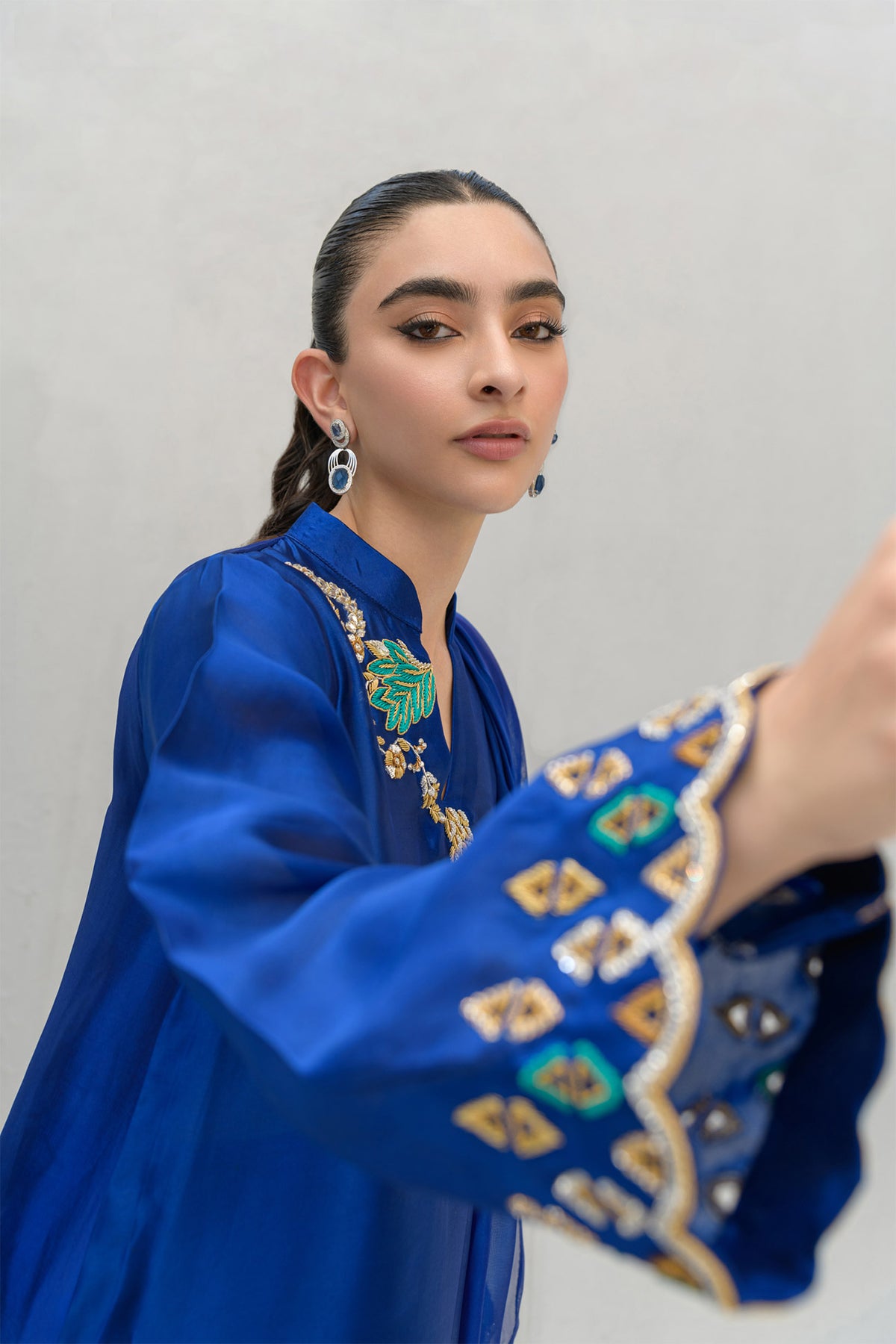 Introducing the latest fashion trend: our stunning blue sheesha silk short shirt ensemble paired with shalwar, designed to turn heads wherever you go. Featuring exquisite handwork in shades of yellow gold, peacock, and silver adorning the border, sleeves, and neckline, this ensemble exudes sophistication and charm. Complementing the look is a pure sheesha organza dupatta with intricate border work, adding an extra touch of elegance. Ideal for grand gatherings and events, it\'s the perfect choice for those seeking impeccable formal attire.