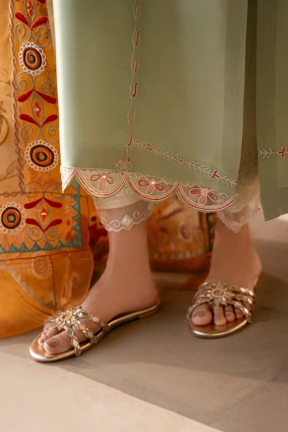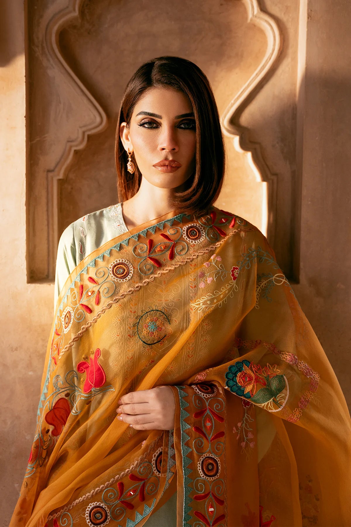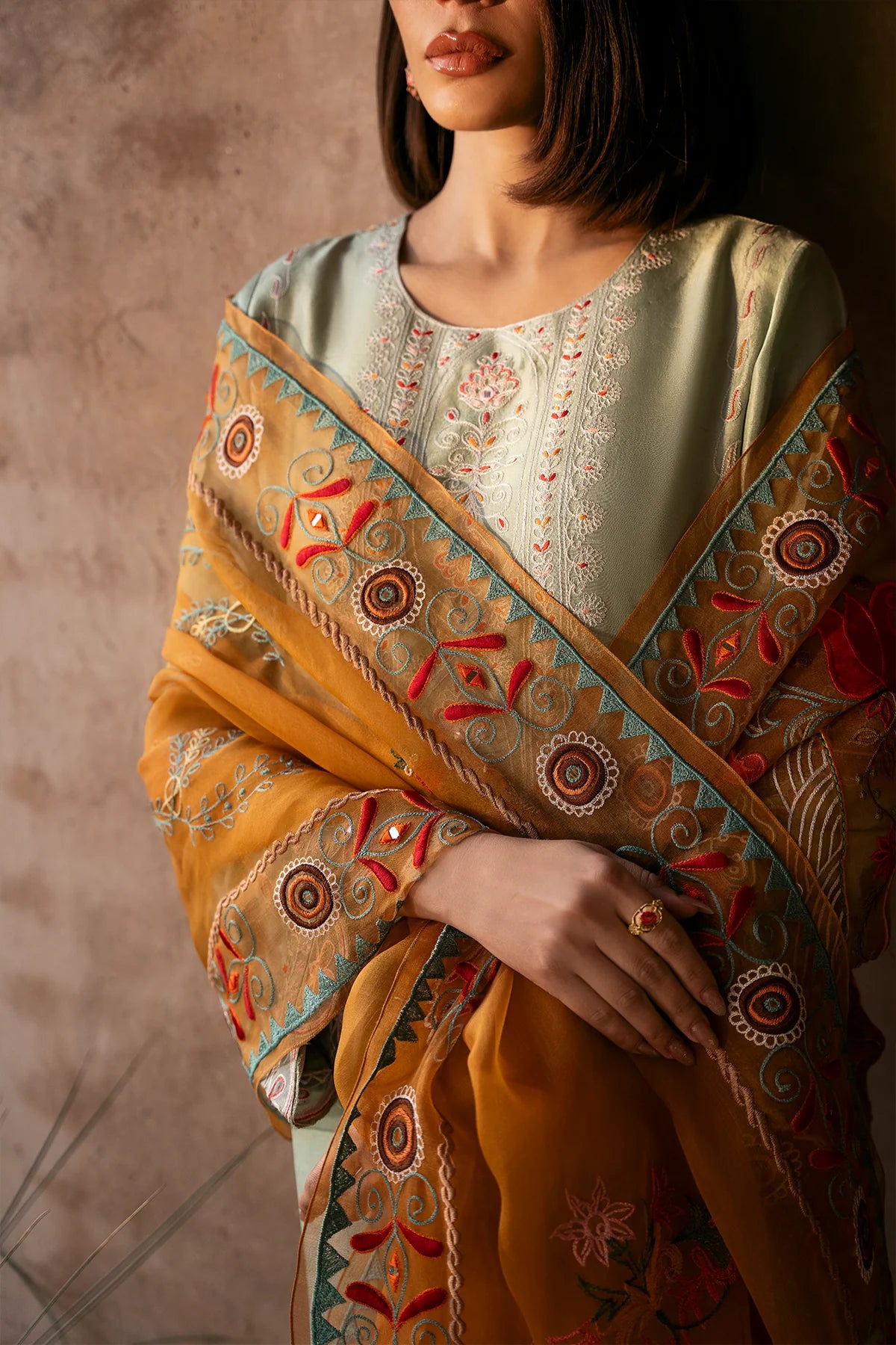 S A F I N A , has intricate embroidery that adds a touch of elegance, while the mirror work creates a beautiful shimmer that catches the light. The vibrant appliqués bring a burst of color and unique design, making this outfit perfect for the festive celebrations. It’s a stunning combination that truly stands out
