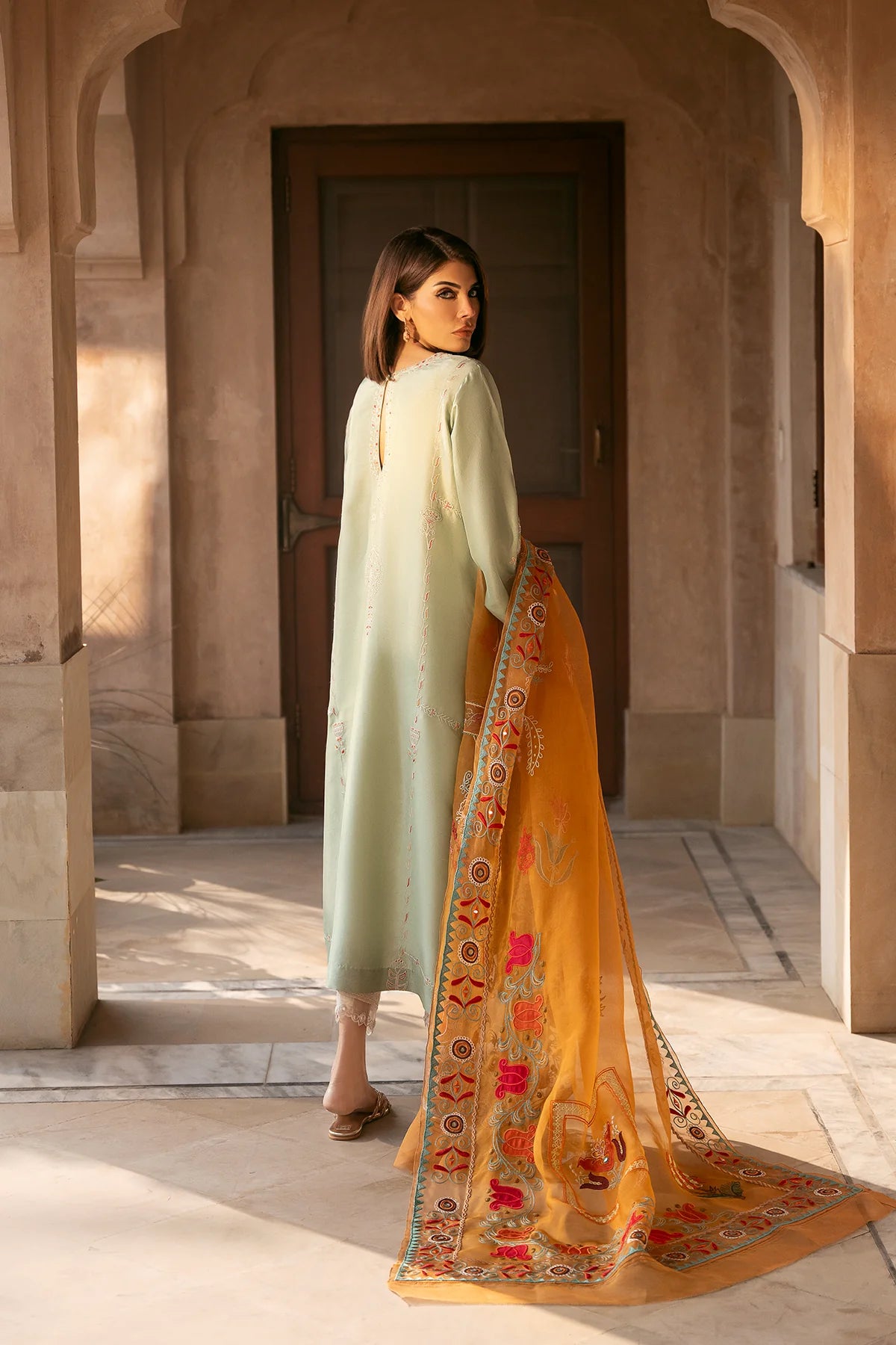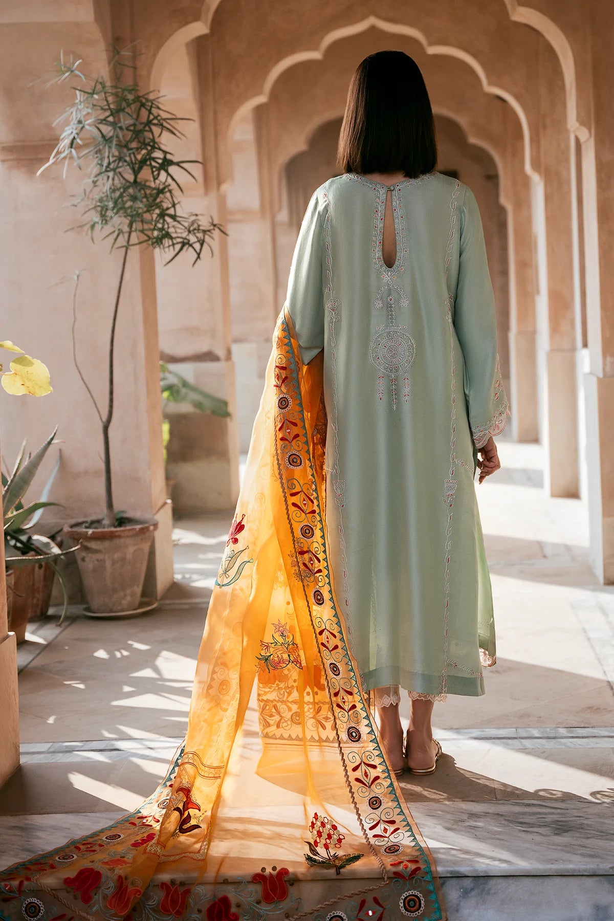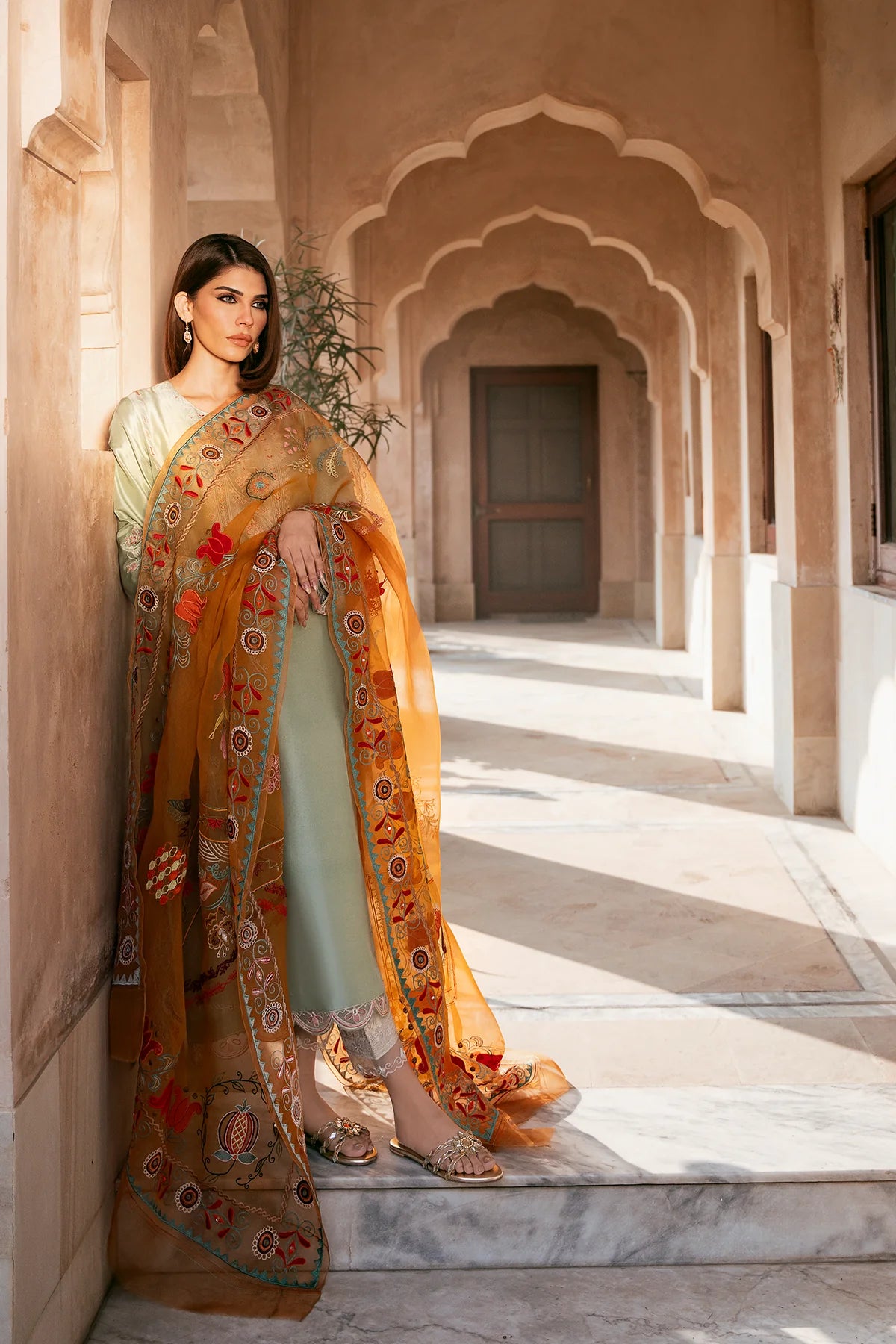S A F I N A , has intricate embroidery that adds a touch of elegance, while the mirror work creates a beautiful shimmer that catches the light. The vibrant appliqués bring a burst of color and unique design, making this outfit perfect for the festive celebrations. It’s a stunning combination that truly stands out