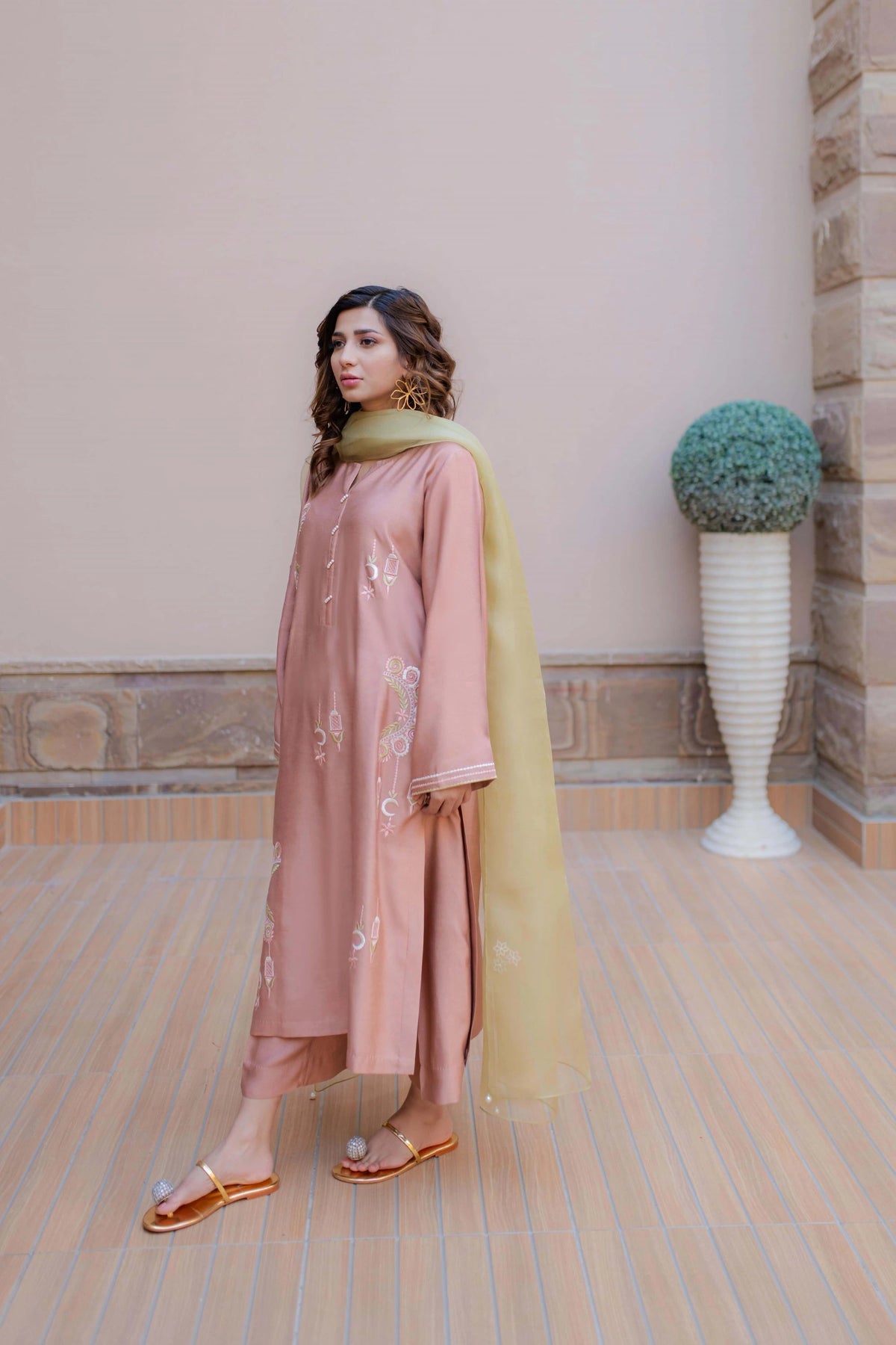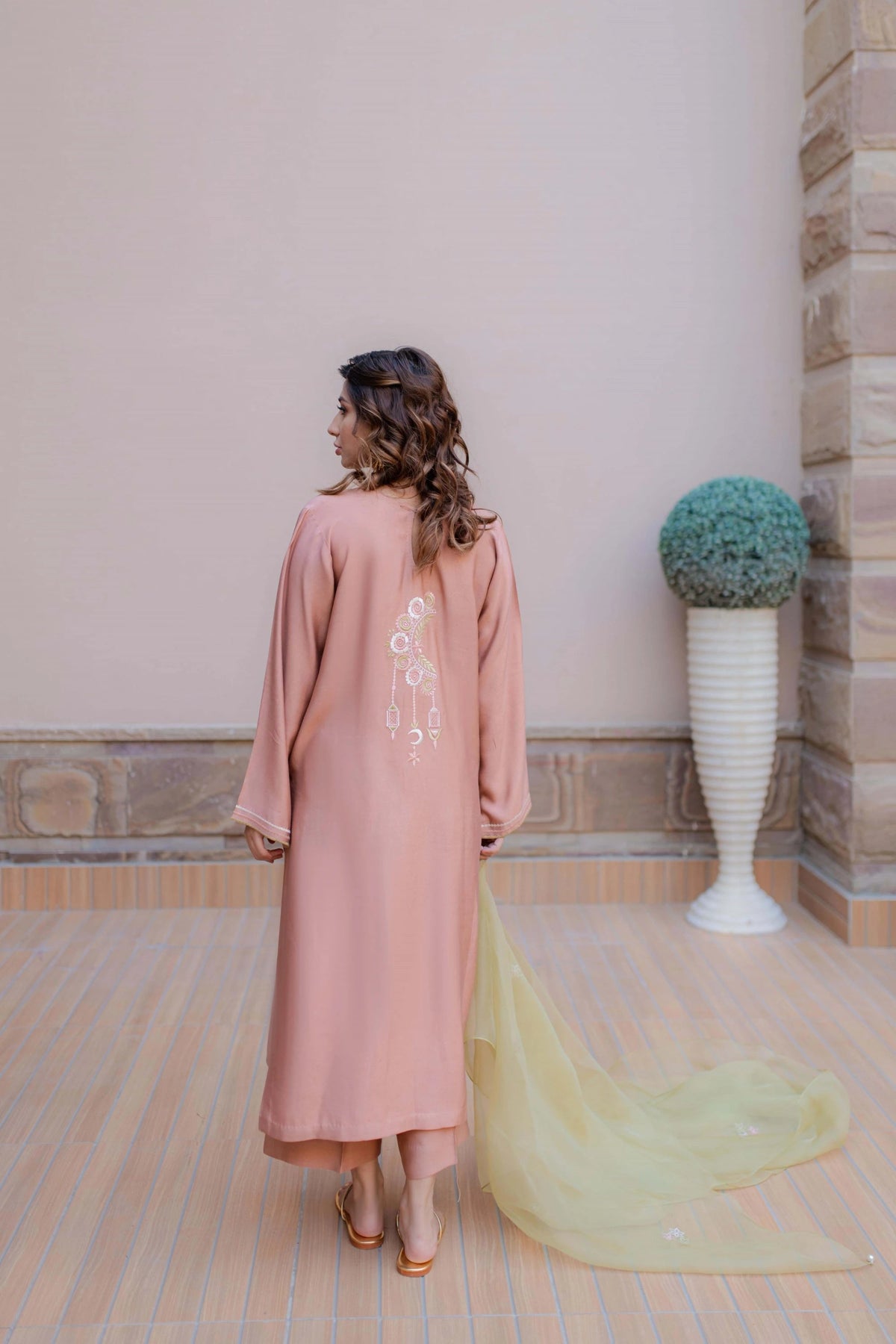 This exquisite three-piece ensemble, in a captivating dusky pink shade, features a long, sleek kameez complemented by izhaar pants and a contrasting dupatta. The embroidery work is truly remarkable, with intricate depictions of the crescent moon and lanterns symbolizing Eid and celebrations, elegantly intertwined with floral motifs. The contrast dupatta enhances the ensemble's depth, while its detailed embroidery elevates its beauty even further.