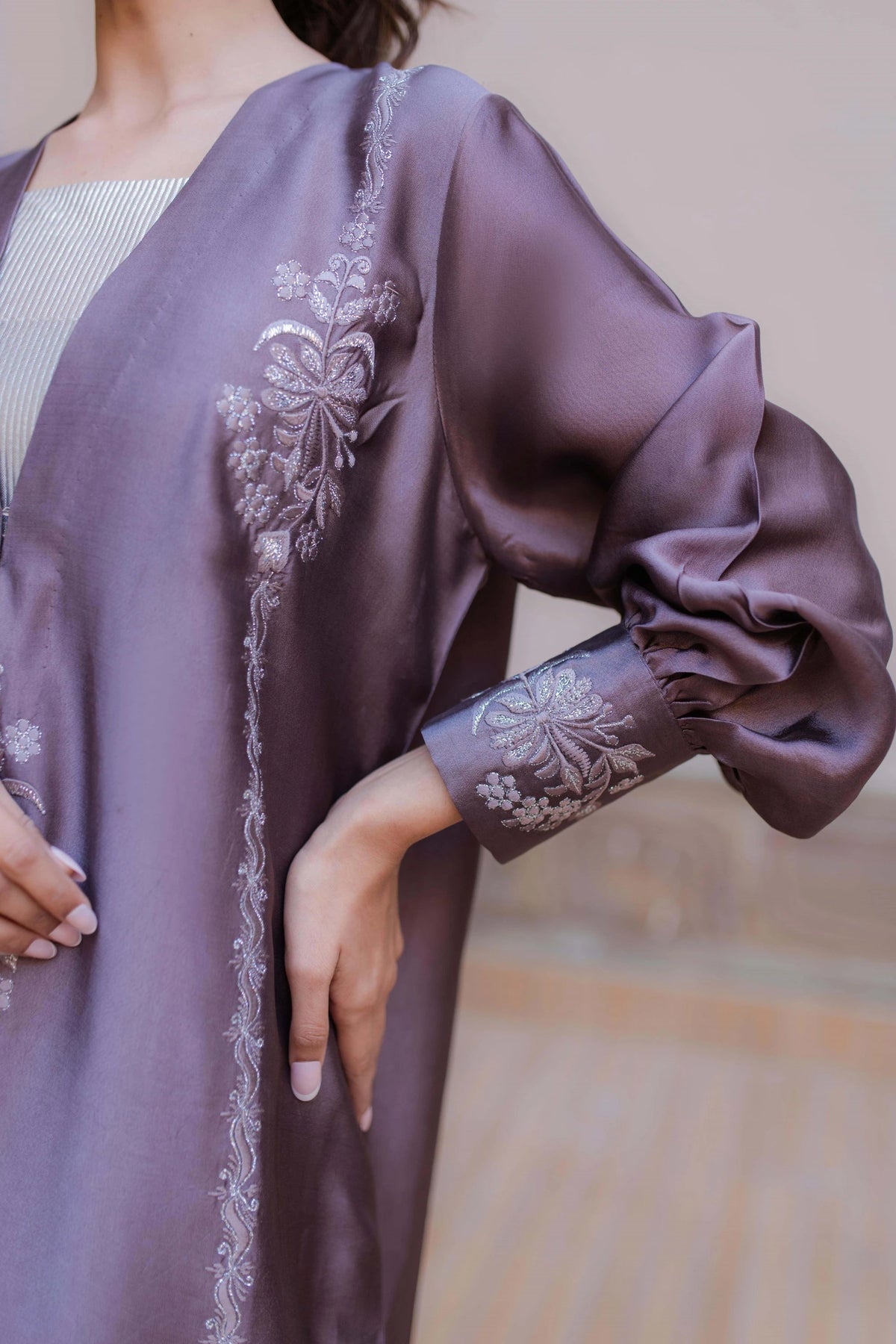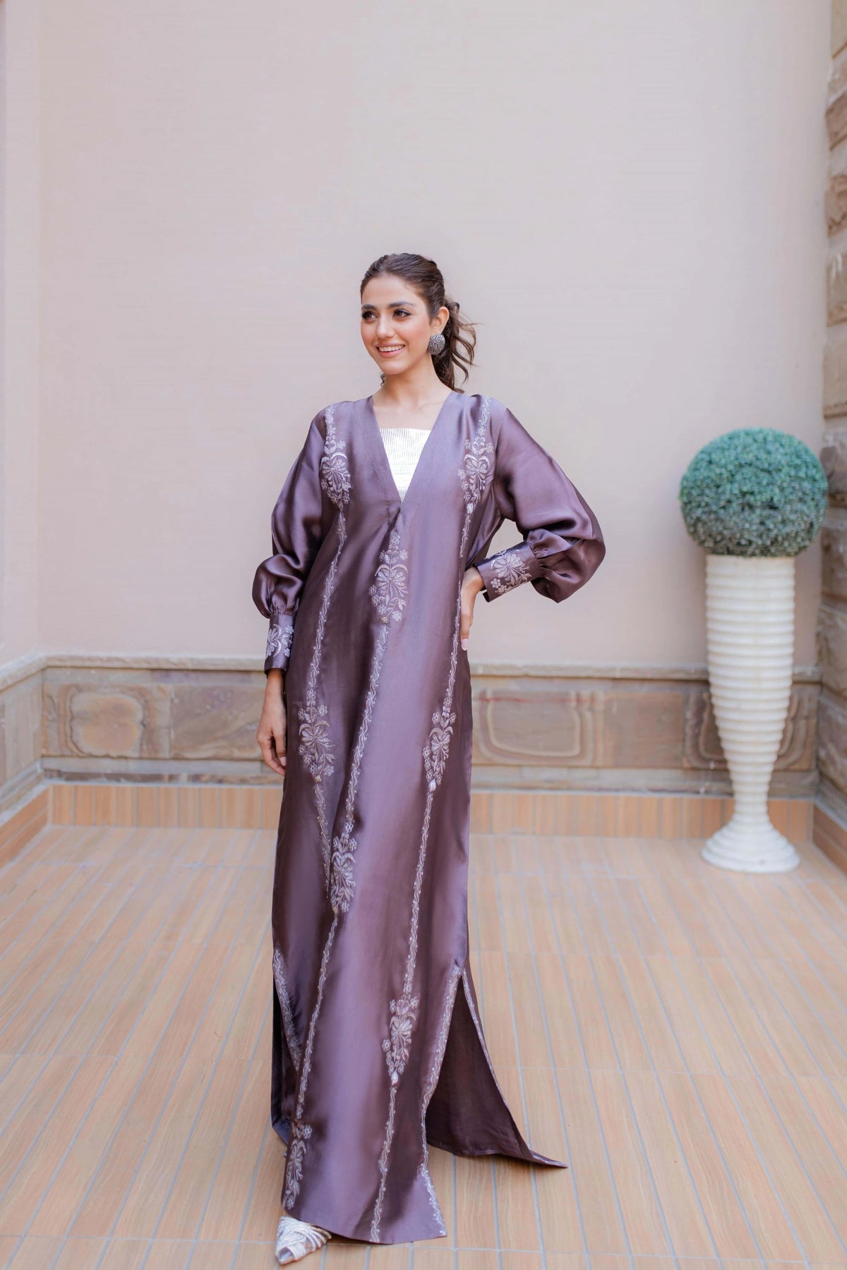 Indulge in elegance with our latest creation: a long dress crafted from the finest fabrics in the most prettiest shade of purple, destined to become a staple in your wardrobe. This must-have ensemble features breathtaking embroidery adorned with delicate baadla accents, elevating its formality further. With graceful long slits on both sides, intricate embroidery, and a captivating back motif, this gown is sure to turn heads. Complete with a lustrous inner lining, it epitomizes sophistication from every angle. Elevate your style and make a statement with this exquisite piece.
