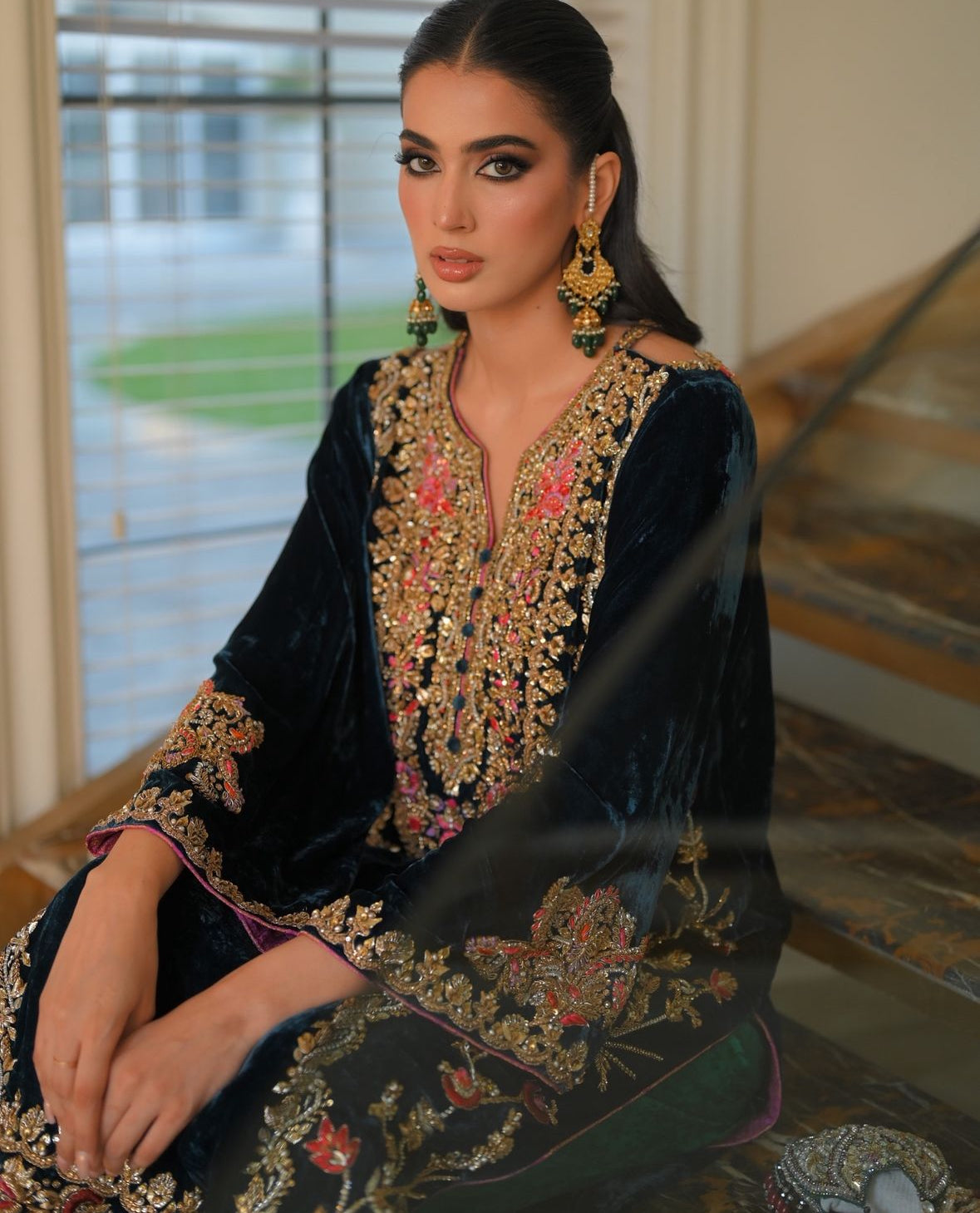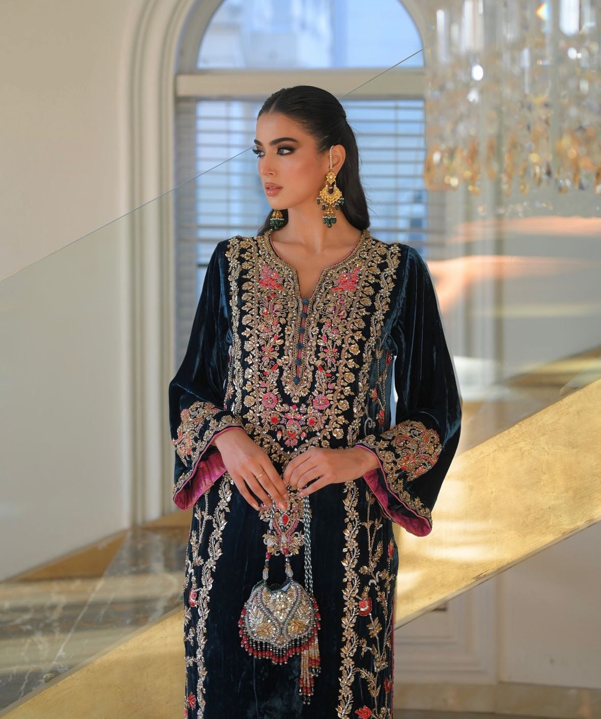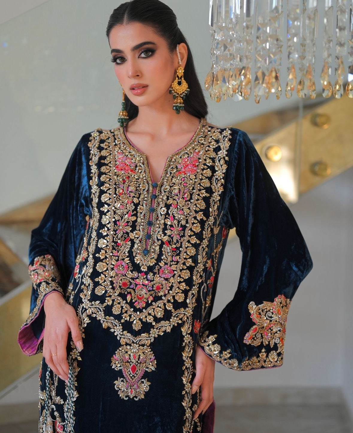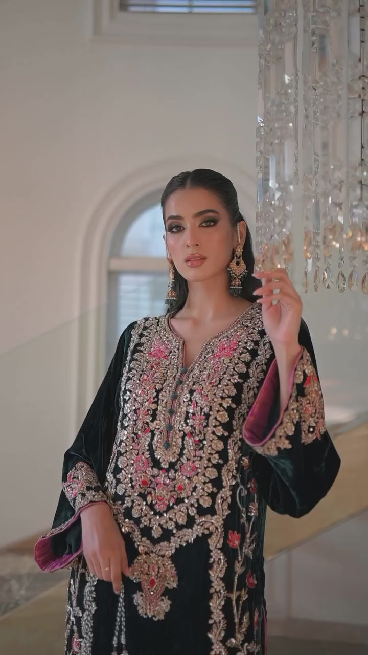 Shirt: Crafted from pure French velvet silk, adorned with intricate hand embroidery featuring dabka, sequins, cutdana beads, and stones for a stunning, opulent look.