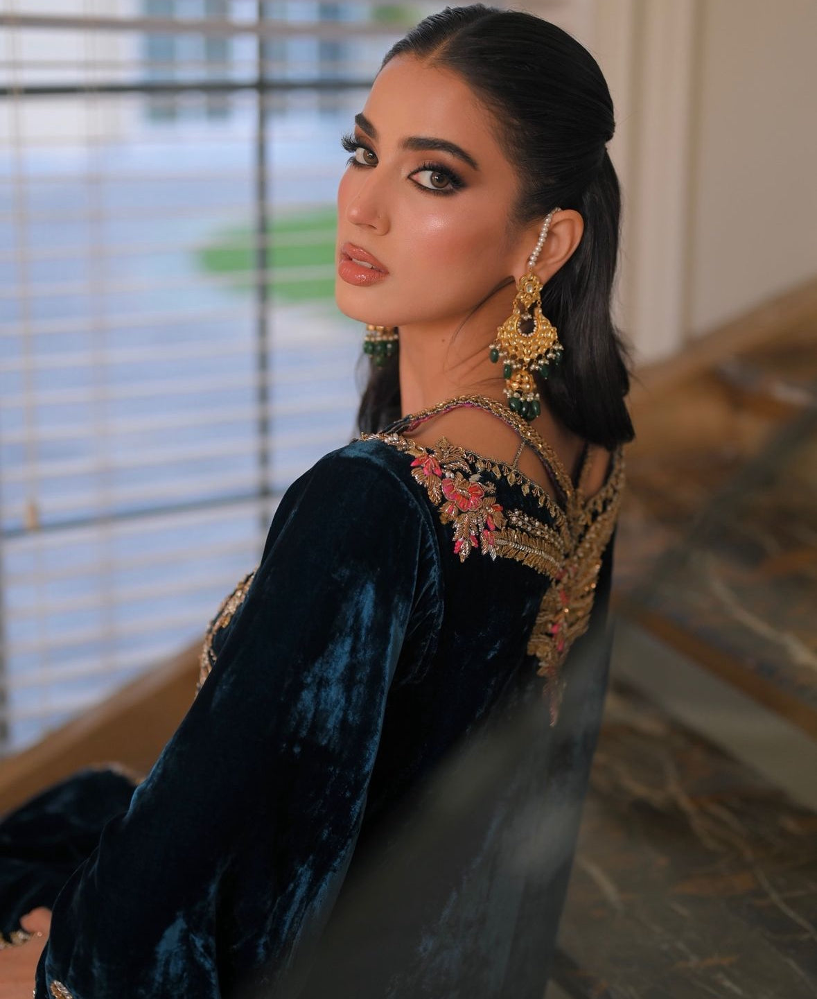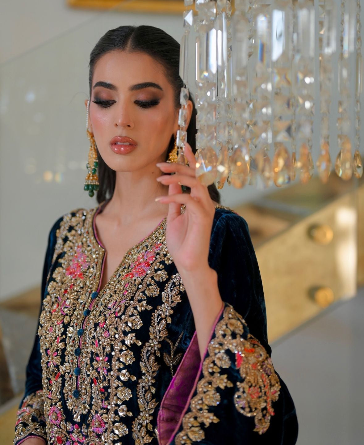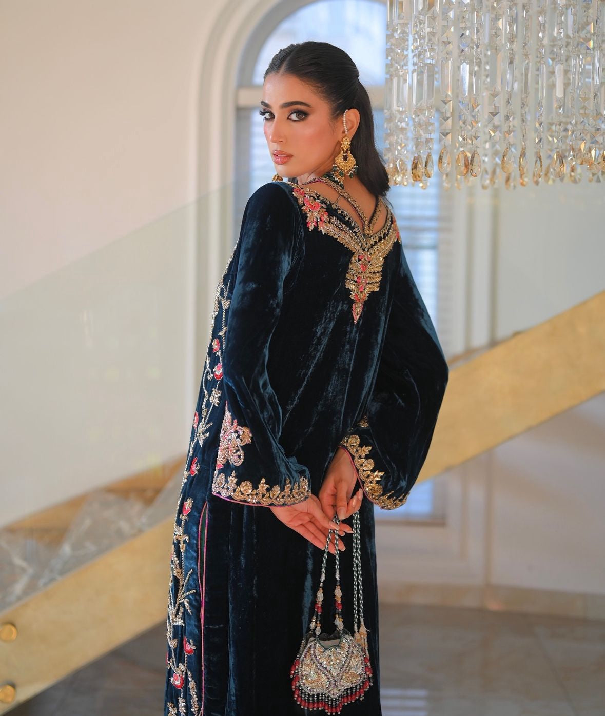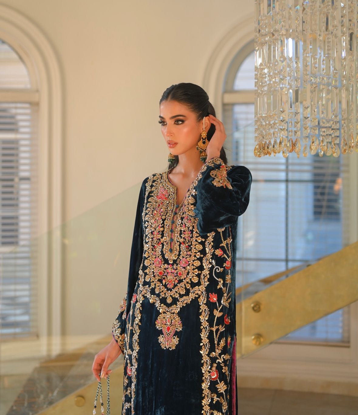Shirt: Crafted from pure French velvet silk, adorned with intricate hand embroidery featuring dabka, sequins, cutdana beads, and stones for a stunning, opulent look.