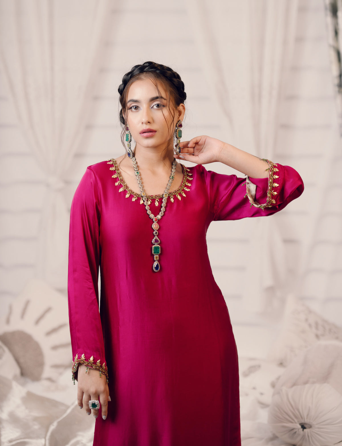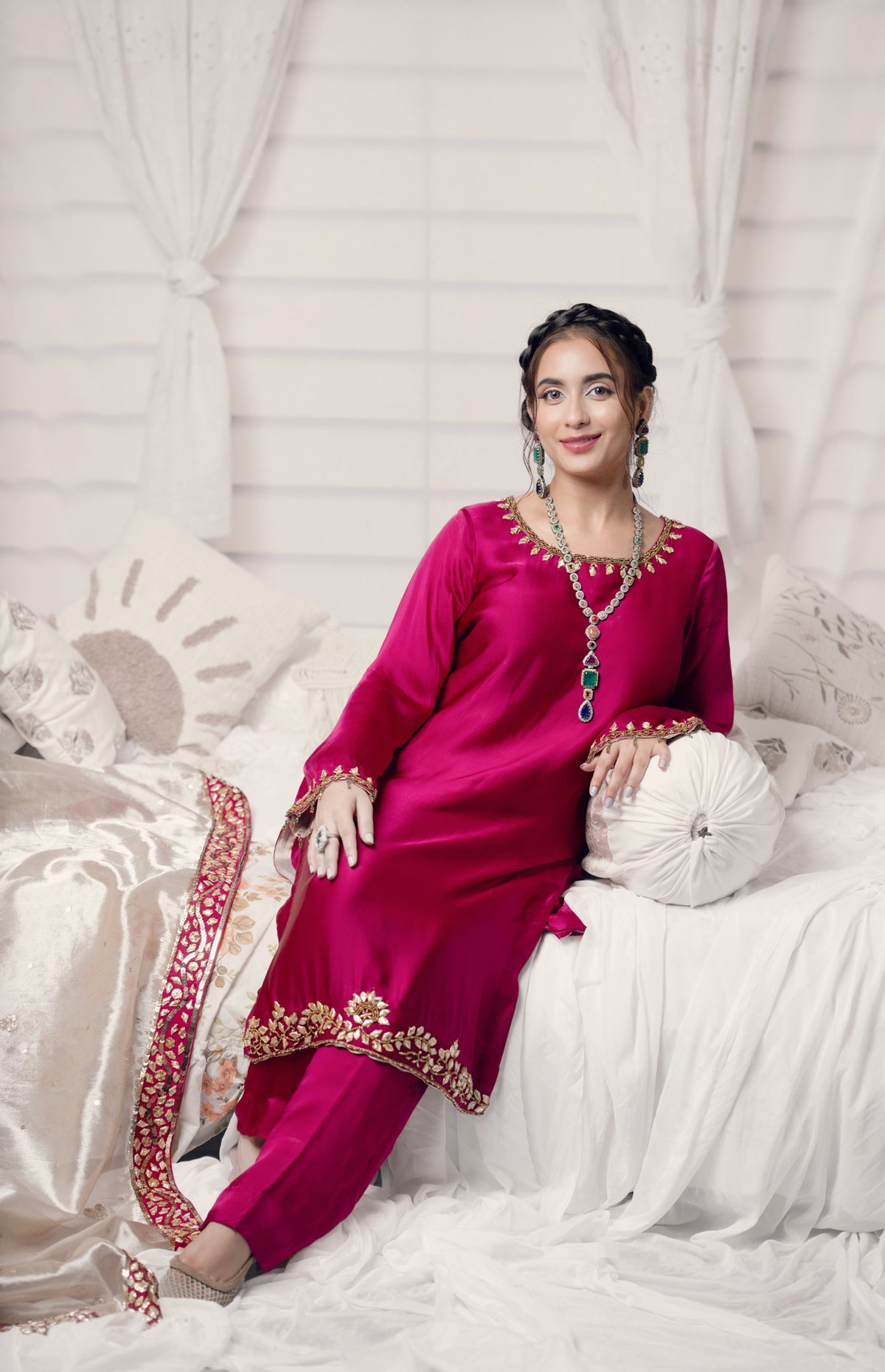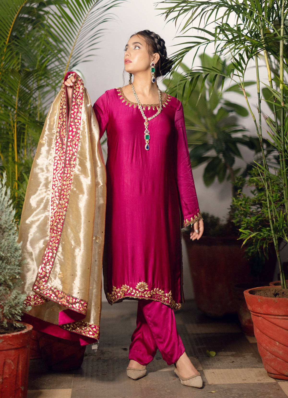 Beautifully designed outfit with a graceful pure silk long shirt, silk pants, and a delicately embellished tissue dupatta.This is a great outfit for special occasions!