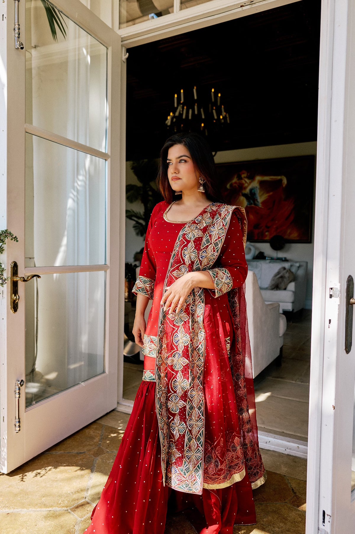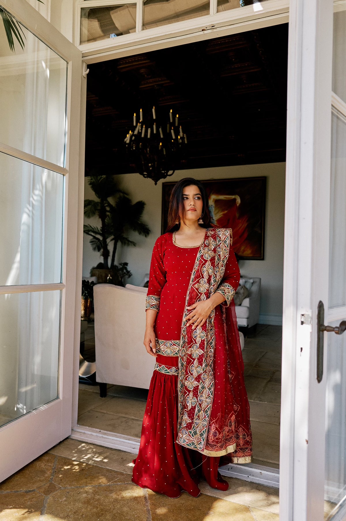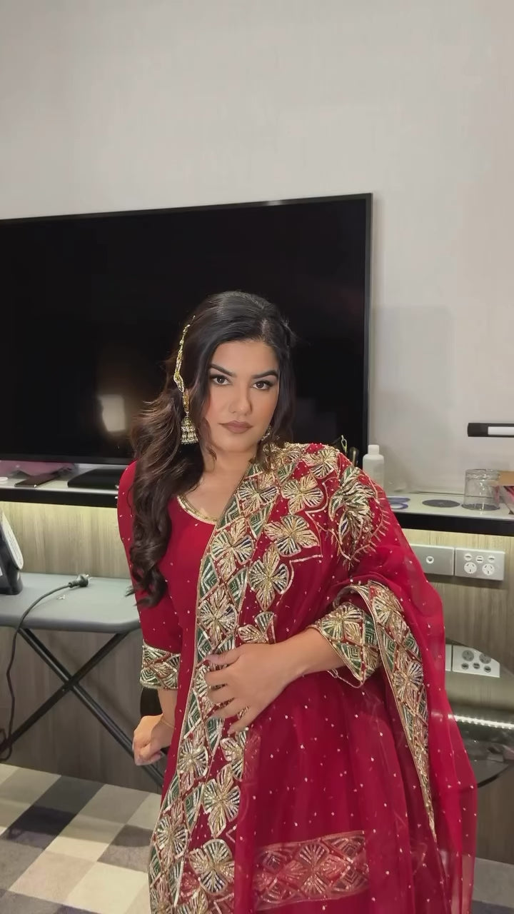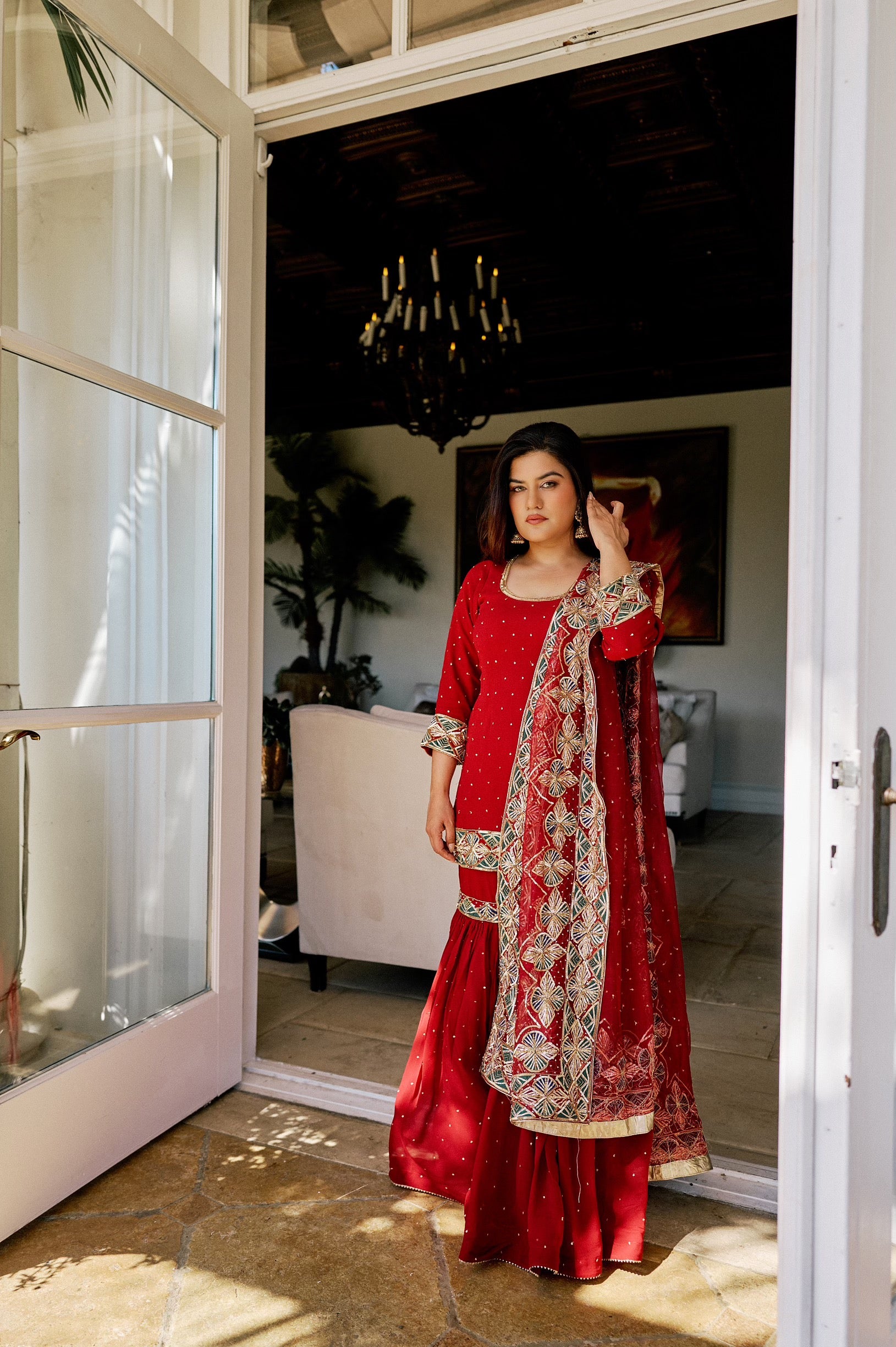 Step into timeless elegance with this pure georgette sharara suit, meticulously crafted for the modern fashionista. The outfit features intricate hand-embroidered gotta work paired with subtle sequins, adding a touch of shimmer and sophistication. Perfect for weddings, festive occasions, or special events, this ensemble radiates grace, charm, and luxury in every detail.