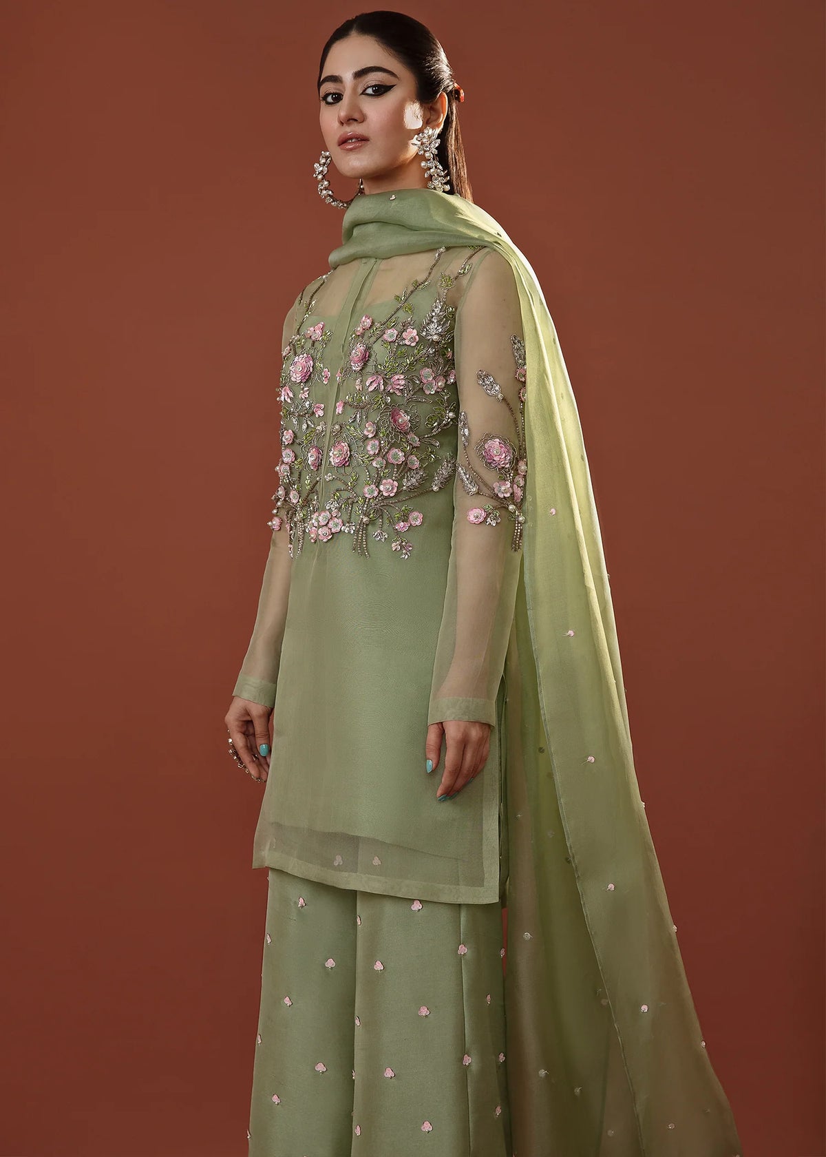 Subtle pistachio pink organza shirt, with pinks floral embellishments in layered sequins and pearls. Paired with lightly embellished palazzo pants and hand embellished dupatta.