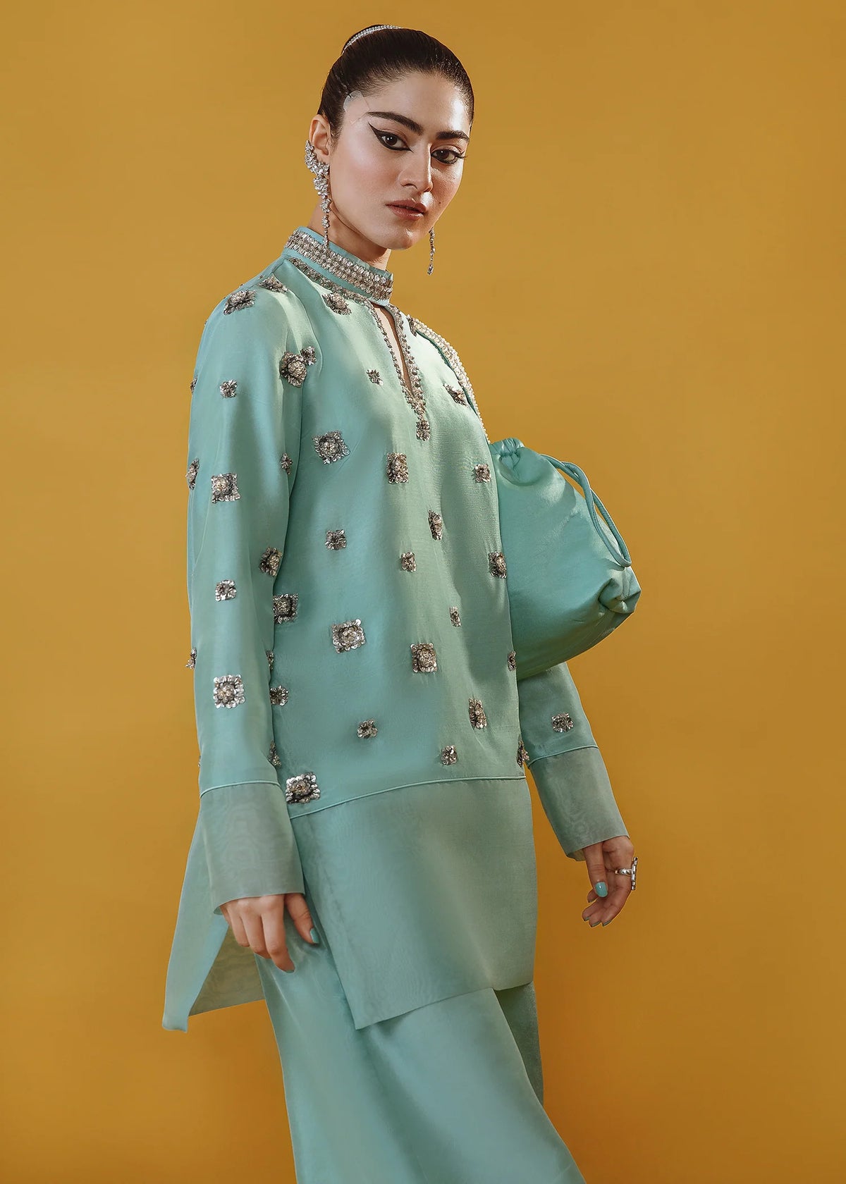This energizing aqua set comes with a classic embellished neckline, with clusters of embellishments all over, paired with silk culottes. Completing the look with subtle sequin and pearl work dupatta.