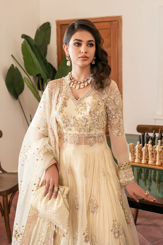 Unleash your inner sophistication with Tehzeeb, a dress that captures the essence of refined beauty. The exquisite organza shirt features delicate embroidery, while the airy organza dupatta adds a touch of ethereal elegance. The crushed raw silk trouser offers a luxurious feel, making this ensemble perfect for any special occasion.