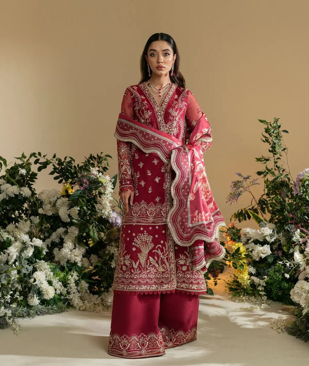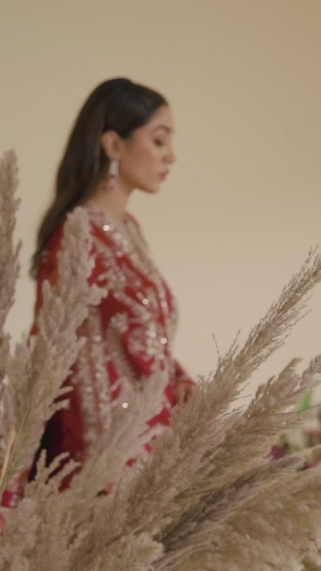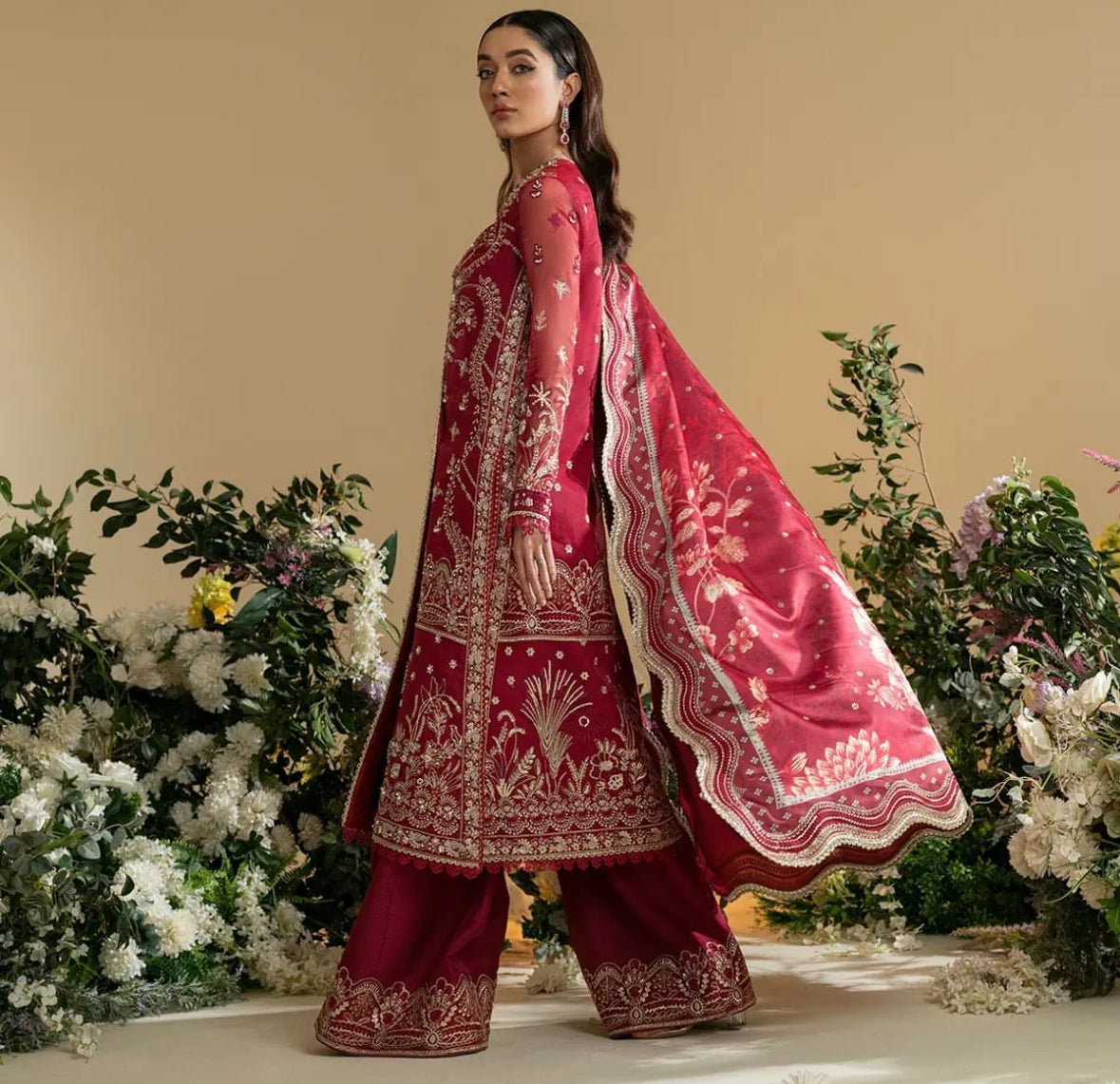 Zara's bridal allure captivates with a vibrant blend of red and pink hues. The organza shirt paired with raw silk trousers creates a perfect harmony. Silk dupatta drapes gracefully, adorned with intricate pearls, dabka, kiran, Tilla, and thread work. A radiant ensemble, where artistry intertwines with passion, leaving admirers enchanted with every exquisite detail.