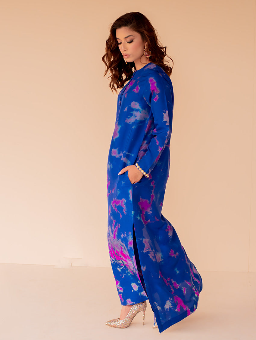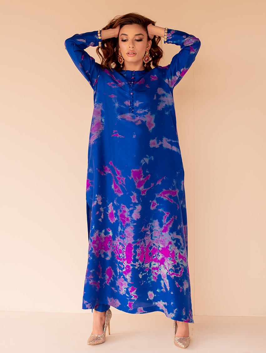 • Tie and dye maxi with pockets and pants in pure raw silk 80gmwith hand done embellishments on the sleeves