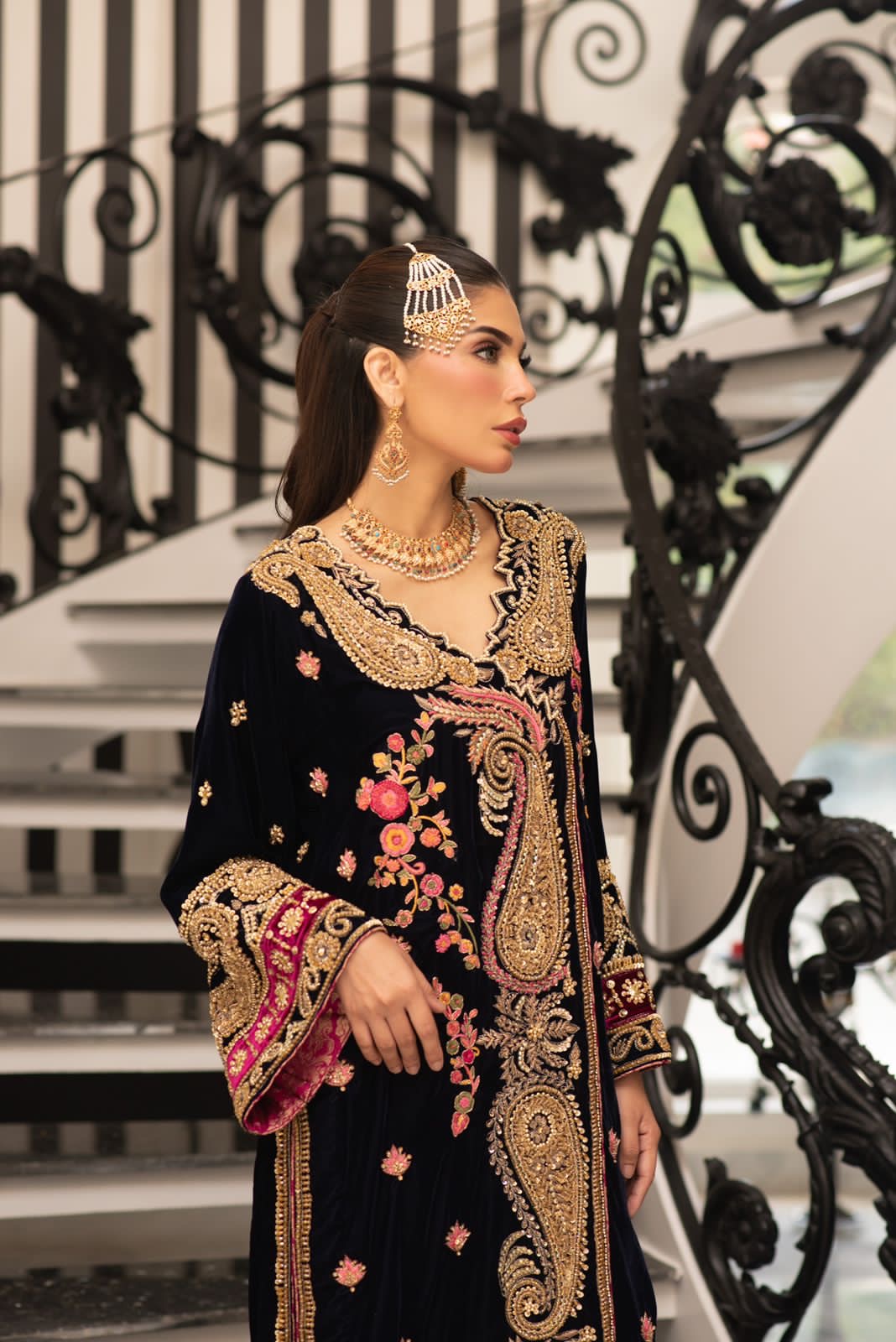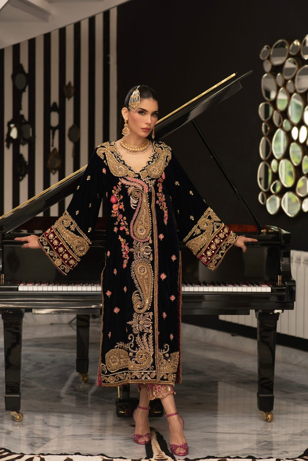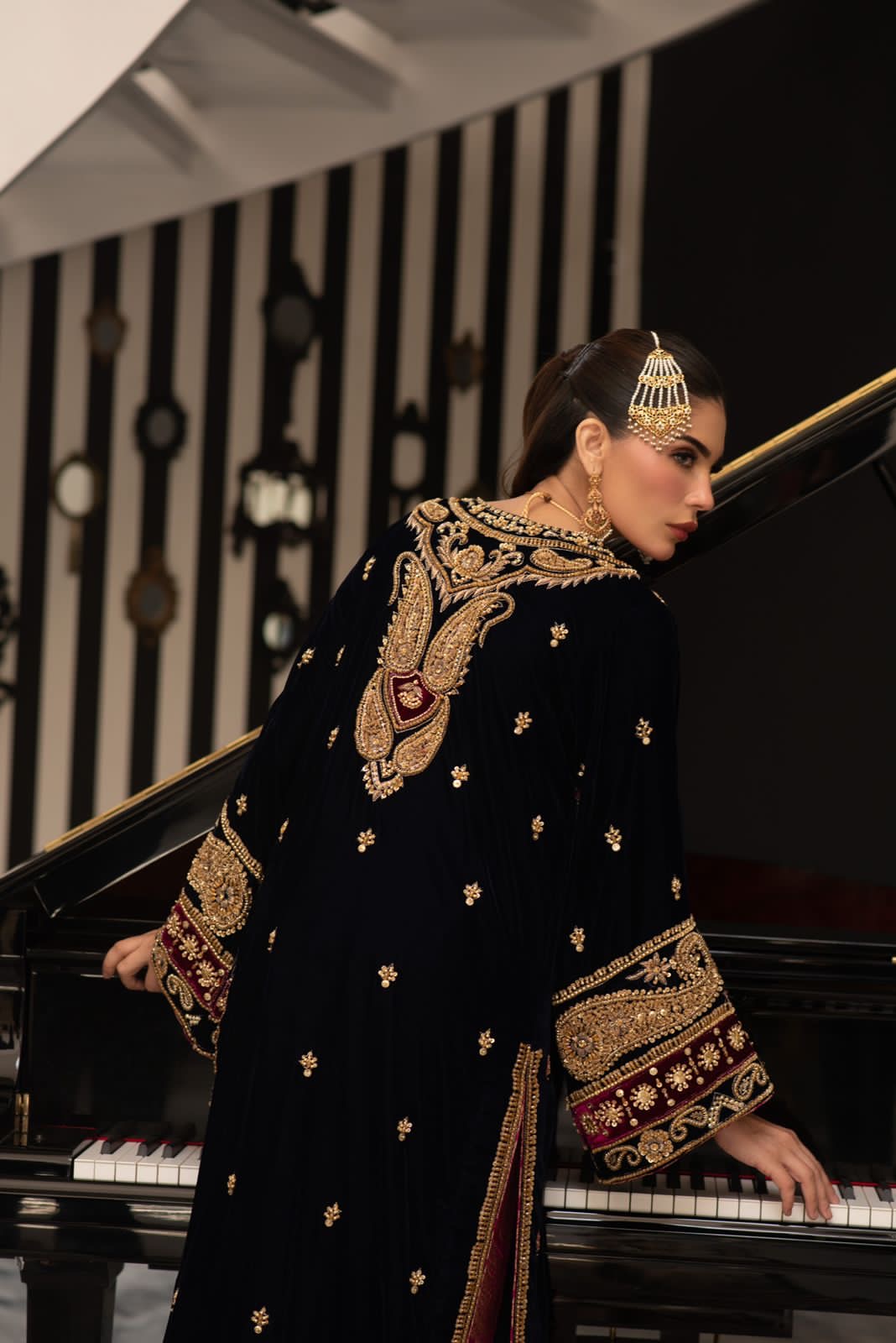 Unveiling the epitome of elegance and craftsmanship! Behold this exquisite ensemble featuring a pure French velvet hand-embroidered shirt paired with pure Jamawar embroidered pants. Every stitch tells a story of artistry and tradition, meticulously crafted to perfection.